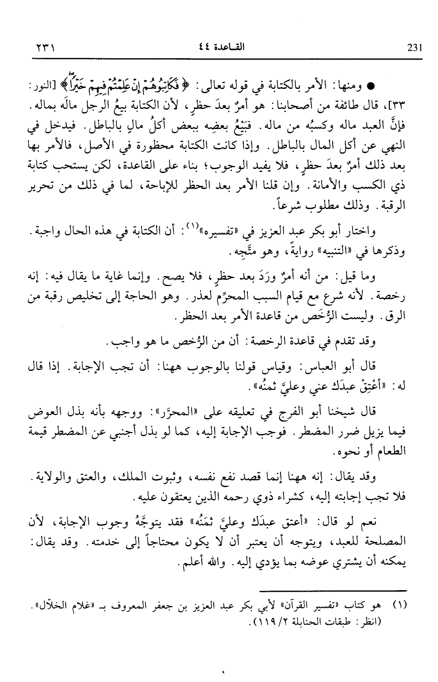 1 هو كتاب "تفسير القرآن" لأبي بكر عبد العزبز بن جعفر المعروف بـ "غلام الخلال" انظر طبقات الحنابلة "2/119".