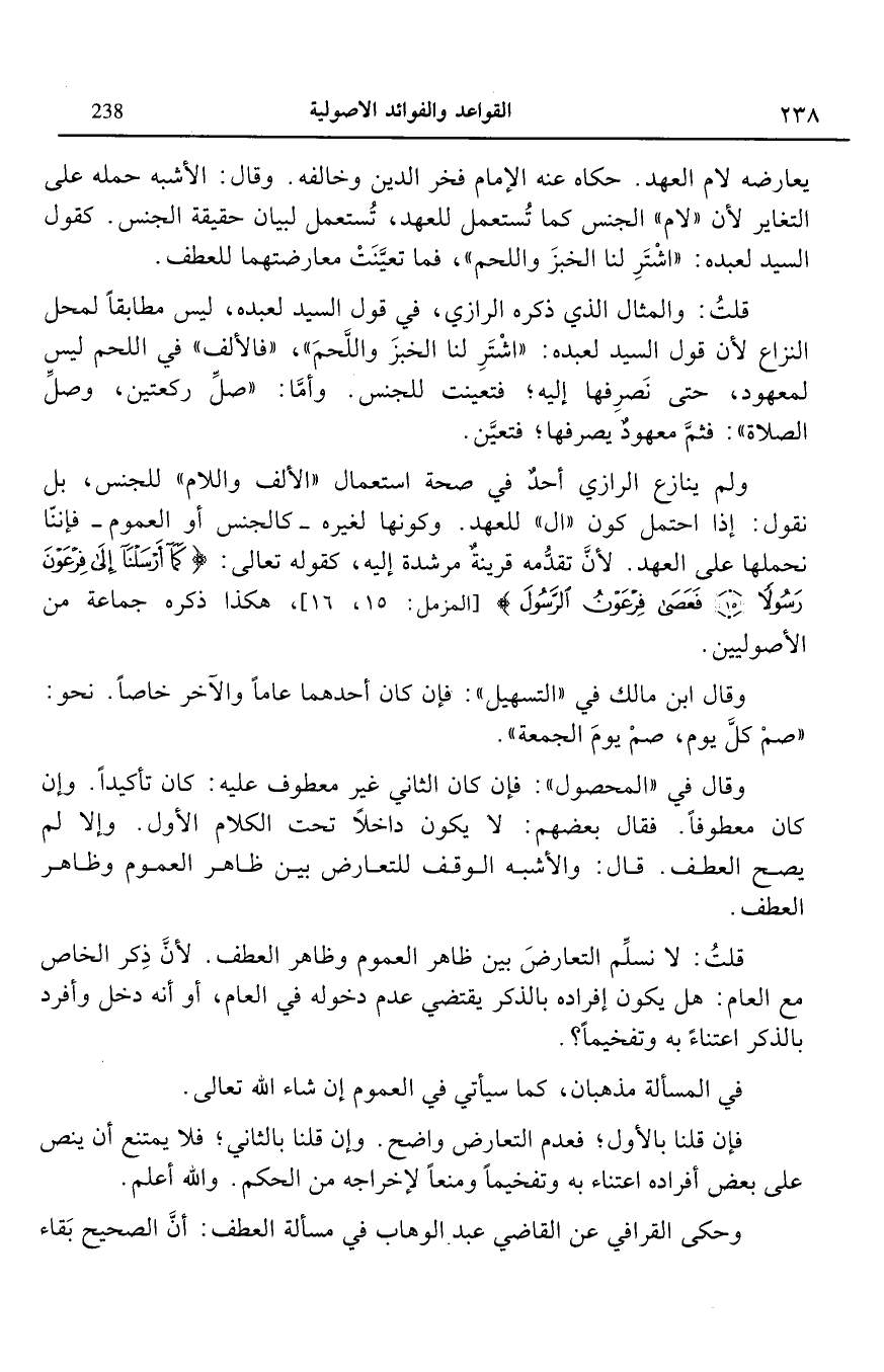 قلت: والمثال الذي ذكره الرازى في قول السيد لعبده ليس مطابقا لمحل النزاع لأن قول السيد لعبده اشتر لنا الخبز واللحم فالألف في اللحم ليس لمعهود حتى نصرفها إليه فتعينت للجنس وأما صل ركعتين وصل الصلاة فثم معهود يصرفها فتعين.