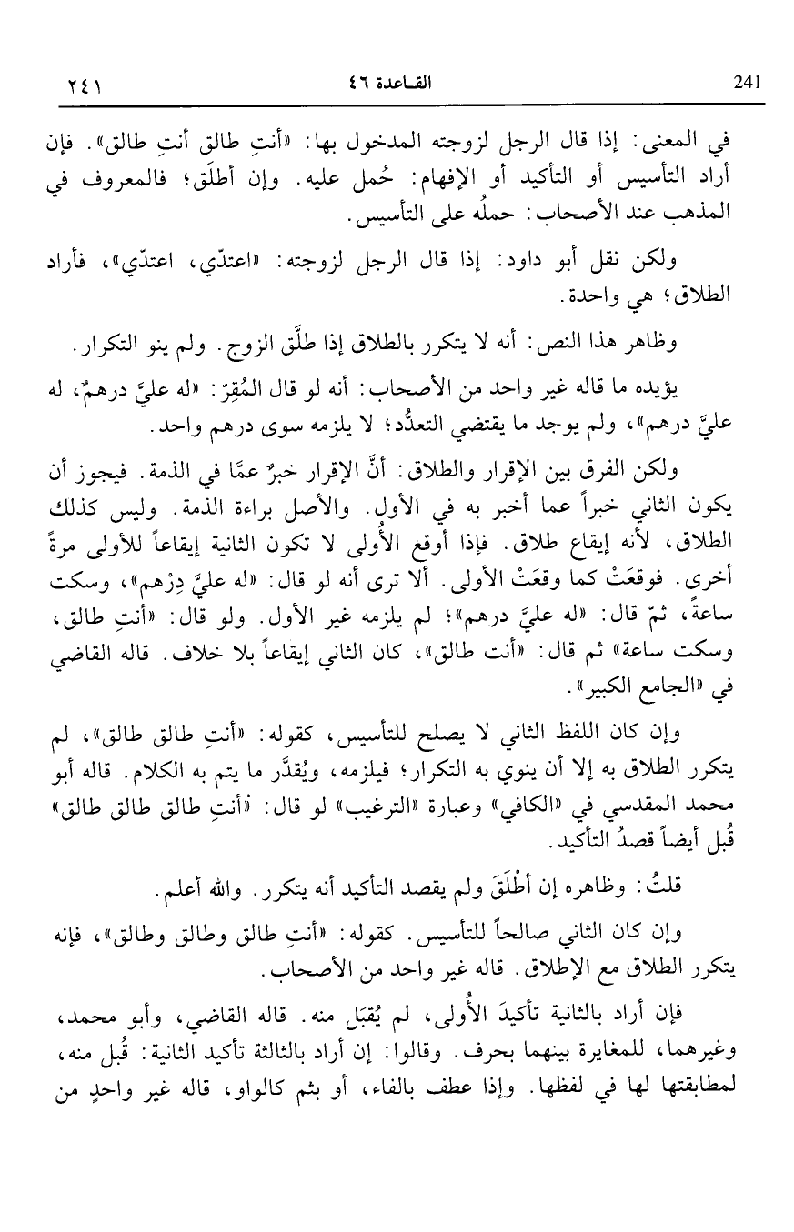 في المعنى إذا قال الرجل لزوجته المدخول بها أنت طالق أنت طالق فإن أراد التأسيس أو التأكيد أو الإفهام حمل عليه وإن أطلق فالمعروف في المذهب عند الأصحاب حمله على التأسيس.