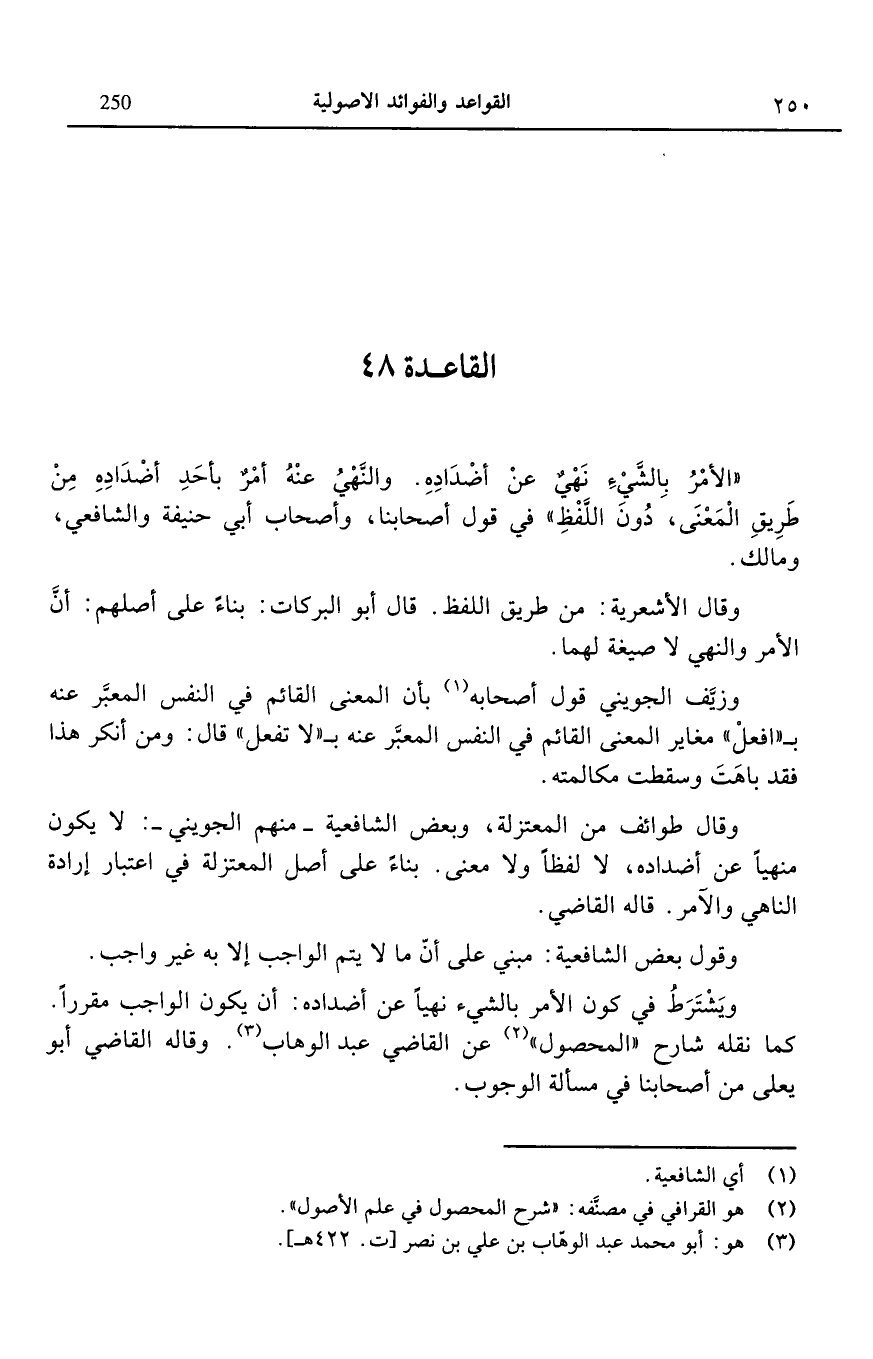 القاعدة 48: الأمر بالشيء نهى عن أضداده والنهي عنه أمر بأحد أضداده من طريق المعنى دون اللفظ في قول أصحابنا وأصحاب أبي حنيفة والشافعي ومالك.