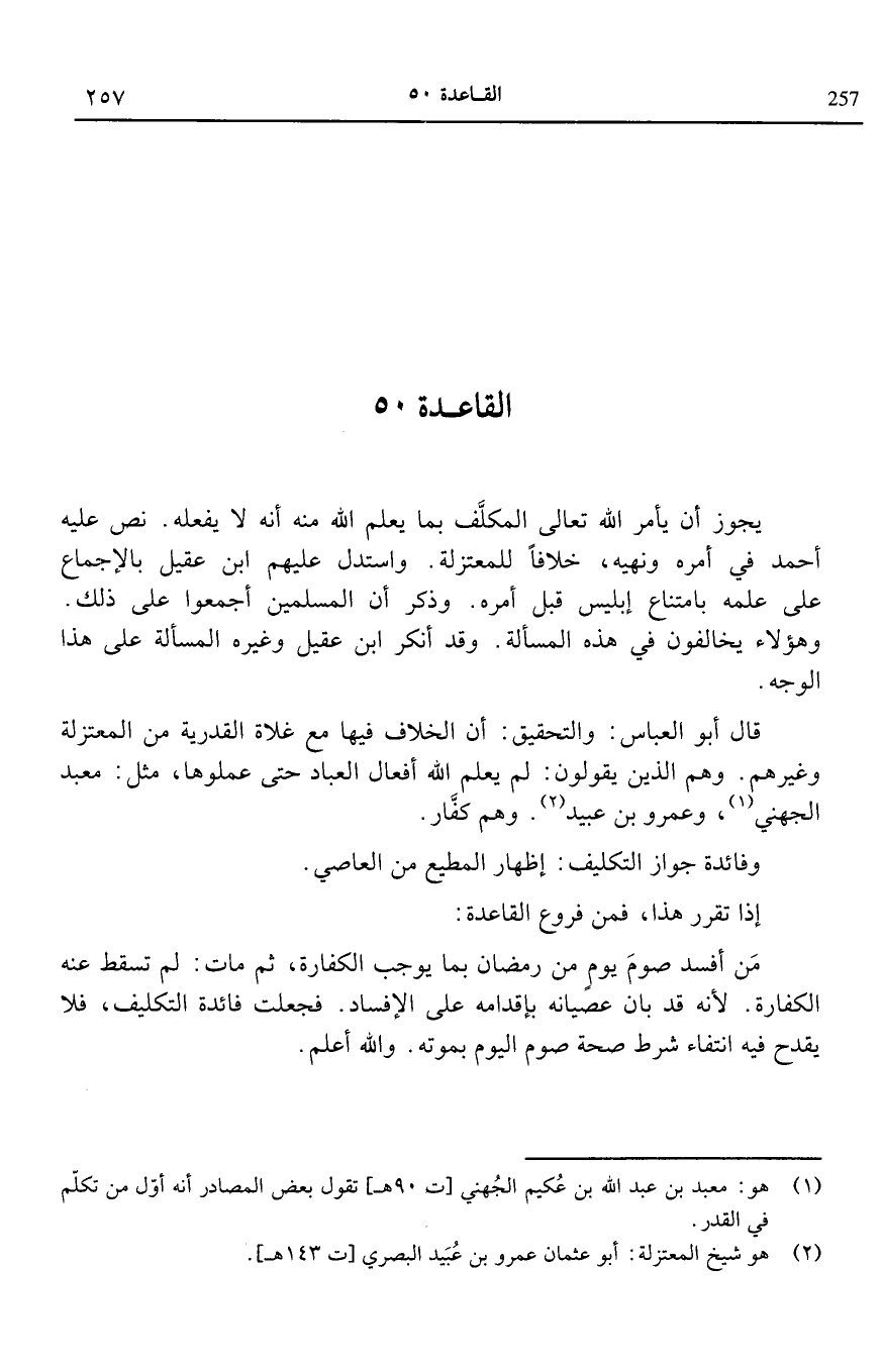 القاعدة 50: يجوز ان يأمر الله تعالى المكلف بما يعلم الله منه أنه لا يفعله نص عليه أحمد في أمره ونهيه خلافا للمعتزلة واستدل عليهم ابن عقيل بالإجماع على علمه بامتناع إبليس قبل أمره وذكر أن المسلمين أجمعوا على ذلك وهؤلاء يخالفون في هذه المسألة وقد أنكر ابن عقيل وغيره المسألة على هذا الوجه.