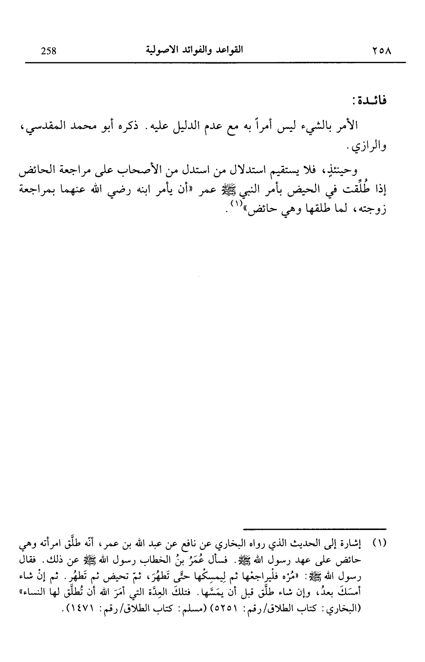 وحينئذ فلا يستقيم استدلال من استدل من الأصحاب على مراجعة الحائض إذا طلقت في الحيض بأمر النبى صلى الله عليه وسلم عمر أن يأمر ابنه رضى الله عنهما بمراجعة زوجته لما طلقها وهى حائض1.