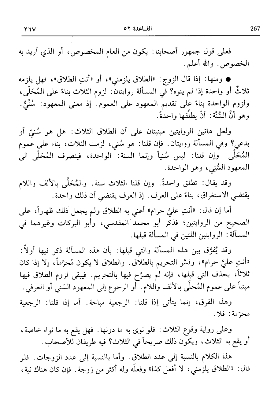 ومنها: إذا قال الزوج الطلاق يلزمنى أو أنت الطلاق فهل يلزمه ثلاث أو واحدة إذا لم ينوه في المسألة روايتان لزوم الثلاث بناء على المحلى ولزوم الواحدة بناء على تقديم المعهود على العموم إذ معنى المعهود سنى وهو أن السنة أن يطلقها واحدة.