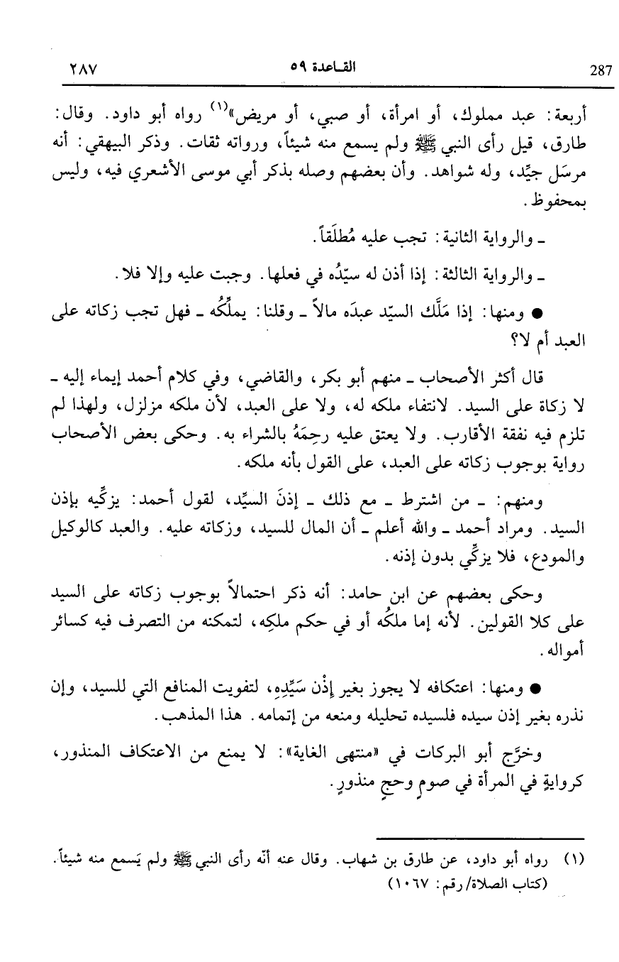 أربعة عبد مملوك أو امرأة أو صبى أو مريض"1 رواه أبو داود وقال طارق قيل رأى النبى صلى الله عليه وسلم ولم يسمع منه شيئا ورواته ثقات وذكر البيهقى أنه مرسل جيد وله شواهد وأن بعضهم وصله بذكر أبى موسى الأشعرى فيه وليس بمحفوظ.