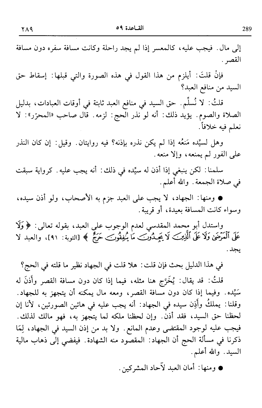 قلت: لا نسلم حق السيد في منافع العبد ثابتة في أوقات العبادات بدليل الصلاة والصوم يؤيد ذلك أنه لو نذر الحج لزمه قال صاحب المحرر لا نعلم فيه خلافا.