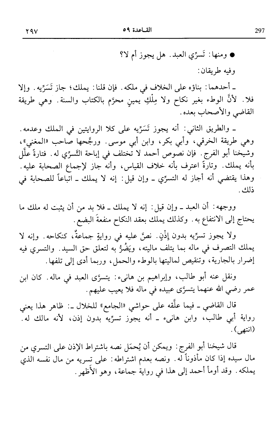 قال شيخنا أبو الفرج ويمكن أن يحمل نصه باشتراط الإذن على التسرى من مال سيده إذا كان مأذونا له ونصه بعدم اشتراطه على تسريه من مال نفسه الذي يملكه وقد أومأ أحمد إلى هذا في رواية جماعة وهو الأظهر.