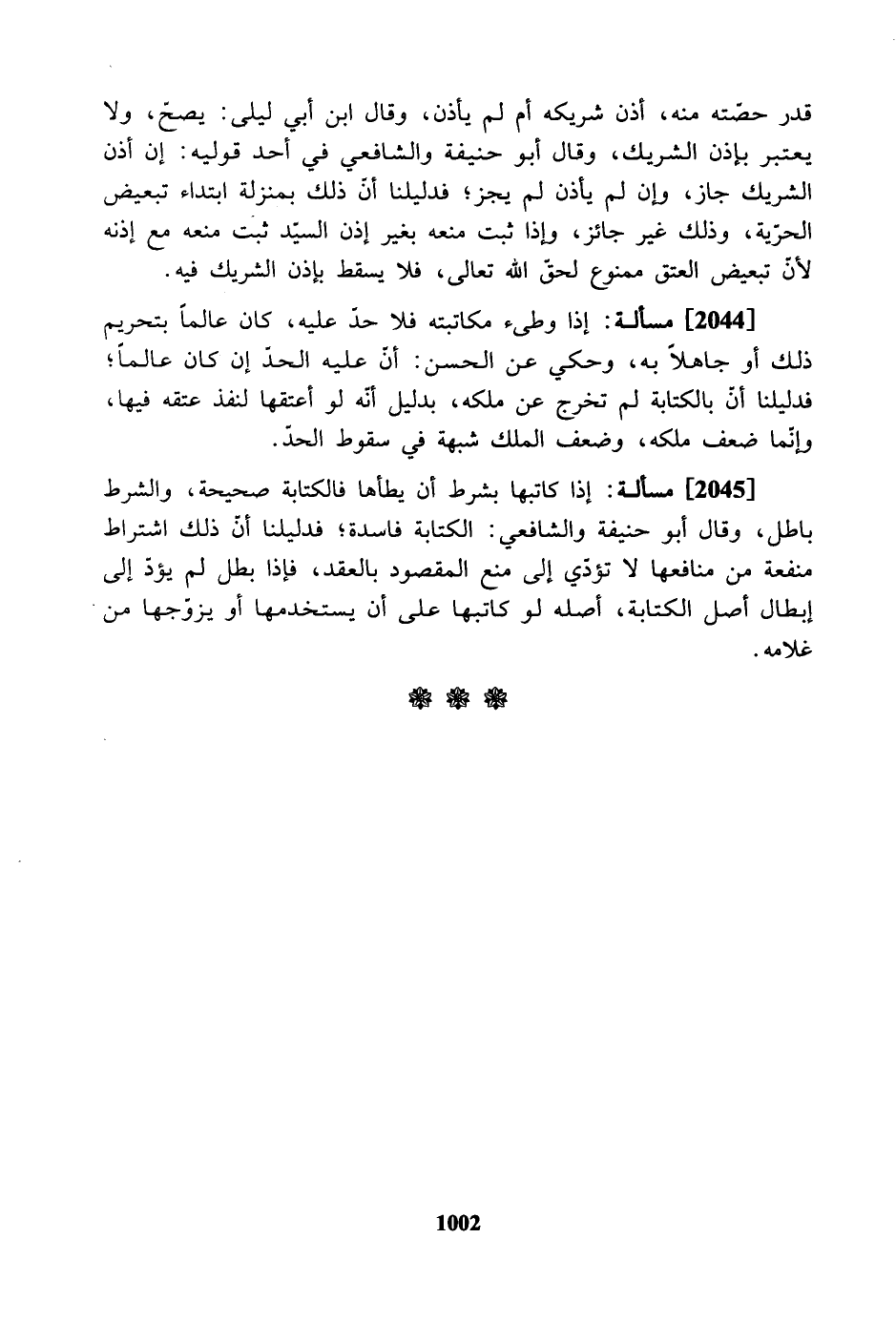 [2044] مسألة: إذا وطىء مكاتبته فلا حدَّ عليه، كان عالماً بتحريم ذلك أو جاهلاً به، وحكي عن الحسن: أنَّ عليه الحدّ إن كان عالماً؛ فدليلنا أن بالكتابة لم تخرج عن ملكه، بدليل أنه لو اعتقها لنفذ عتقه فيها، وإنما ضعف ملكه، وضعف الملك شبهة في سقوط الحدّ.
