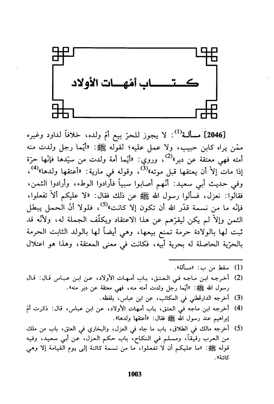 [2046] مسألة: لا يجوز للحر بيع أم ولده، خلافاً لداود وغيره ممن يراه كابن حبيب، ولا عمل عليه؛ لقوله صلى الله عليه وسلم: «أيما رجل ولدت منه أمته فهي معتقة عن دبر»، وروي: «أيما أمة ولدت من سيدها فإنّها حرة إذا مات إلا أن يعتقها قبل موته»، وقوله في مارية: «أعتقها ولدها»، وفي حديث أبي سعيد: أنهم أصابوا سبياً فأرادوا الوطء، وأرادوا الثمن، فقالوا: نعزل، فسألوا رسول الله صلى الله عليه وسلم عن ذلك فقال: «لا عليكم ألا تفعلوا، فإنه ما من نسمة قدر الله أن تكون إلا كانت»، فلولا أنّ الحمل يبطل الثمن وإلا لم يكن ليقرهم عن هذا الاعتقاد ويكلّف الجملة له، ولأنّه قد ثبت لها بالولادة حرمة تمنع بمعها، وهي أيضاً لها بالولد الثابت الحرمة بالحرية الحاصلة له بحرية أبيه، فكانت في معنى المعتقة، وهذا هو اعتلال