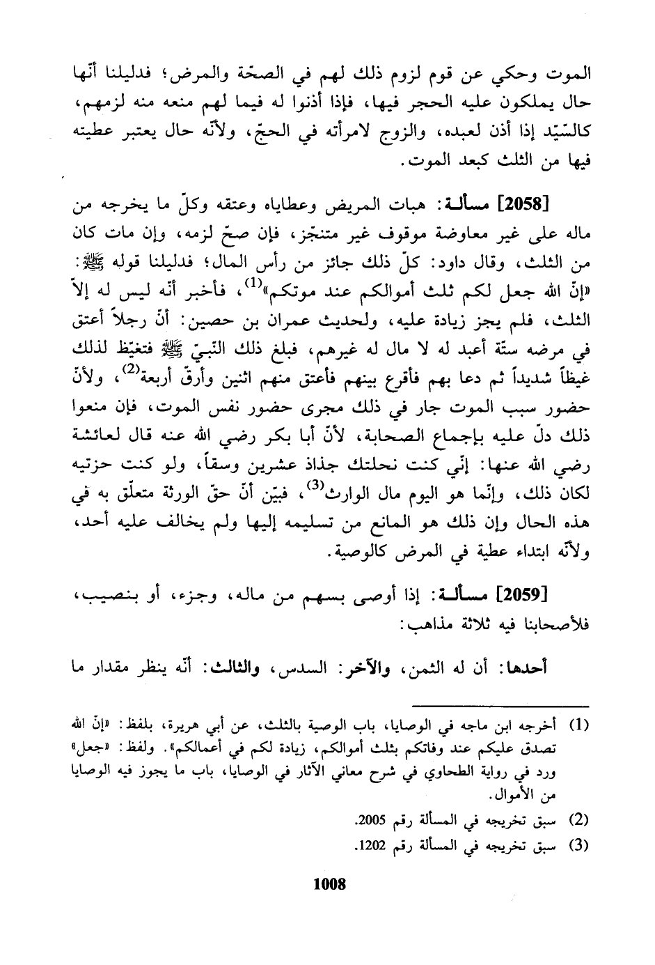 [2058] مسألة: هبات المريض وعطاياه وعتقه وكل ما يخرجه من ماله على غير معاوضة موقوف غير متنجز، فإن صحّ لزمه، وإن مات كان من الثلث، وقال داود: كل ذلك جائز من رأس المال؛ فدليلنا قوله صلى الله عليه وسلم: «إن الله جعل لكم ثلث أموالكم عند موتكم»، فأخبر أنّه ليس له إلا الثلث، فلم يجز زيادة عليه، ولحديث عمران بن حصين: أن رجلاً أعتق في مرضه ستة أعبد له لا مال له غيرهم، فبلغ ذلك النبي صلى الله عليه وسلم فتغيظ لذلك غيظاً شديدًا ثم دعا بهم فأقرع بينهم فأعتق منهم اثنين وأرق أربعة، ولأن حضور سبب الموت جار في ذلك مجرى حضور نفس الموت، فإن منعوا ذلك دل عليه باجماع الصحابة، لأن أبا بكر رضي الله عنه قال لعائشة رضي الله عنها: إني كنت نحلتك جذاذ عشرين وسقاً، ولو كنت حزتيه لكان ذلك، وإنما هو اليوم مال الوارث، فبين أن حق الورثة متعلّق به في هذه الحال وإن ذلك هو المانع من تسليمه إليها ولم يخالف عليه أحد، ولأنه ابتداء عطية في المرض كالوصية.