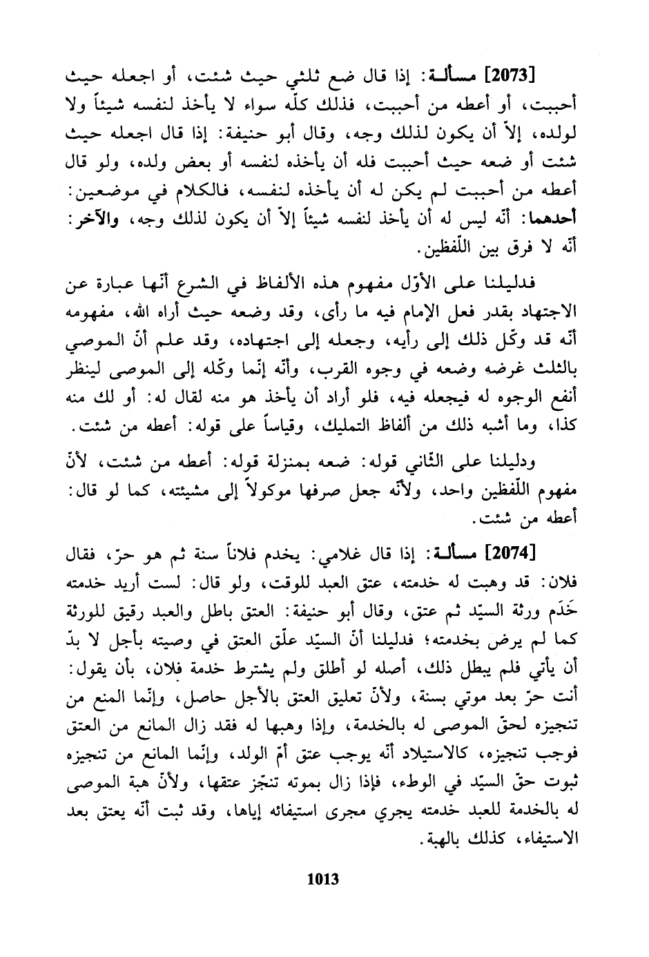 فدليلنا على الأول مفهوم هذه الألفاظ في الشرع أنها عبارة عن الاجتهاد بقدر فعل الإمام فيه ما رأى، وقد وضعه حيث أراه الله، مفهومه أنه قد وكل ذلك إلى رأيه، وجعله إلى اجتهاده، وقد علم أن الموصي بالثلث غرضه وضعه في وجوه القرب، وأنه إنما وكله إلى الموصى لينظر أنفع الوجوه له فيجعله فيه، فلو أراد أن يأخذ هو منه لقال له: أو لك منه كذا، وما أشبه ذلك من ألفاظ التمليك، وقياساً على قوله: أعطه من شئت.