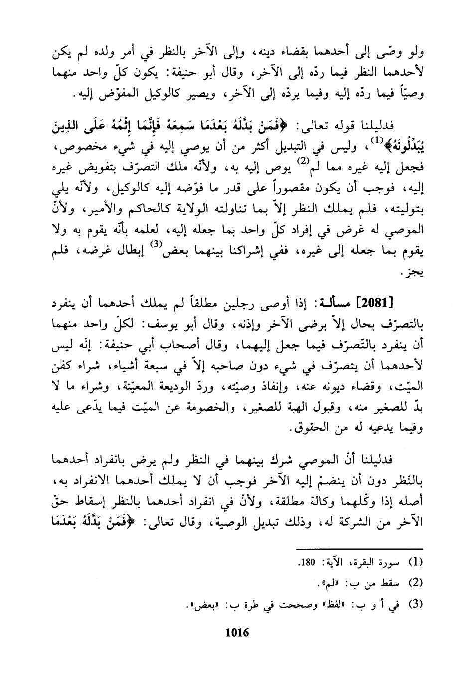 فدليلنا قوله تعالى: "فمن بدلة بعدما سمعه فإنما إثمه على الذين يبدلونه"، وليس في التبديل أكثر من أن يوصي إليه في شيء مخصوص، فجعل إليه غيره مما لم يوص إليه به، ولأنه ملك التصرف بتفويض غيره إليه، فوجب أن يكون مقصورًا على قدر ما فوضه إليه كالوكيل، ولأنه يلي بتوليته، فلم يملك النظر إلا بما تناولته الولاية كالحاكم والأمير، ولأن الموصي له غرض في إفراد كل واحد بما جعله إليه، لعلمه بأنّه يقوم به ولا يقوم بما جعله إلى غيره، ففي إشراكنا بينهما بعض إبطال غرضه، فلم يجز.