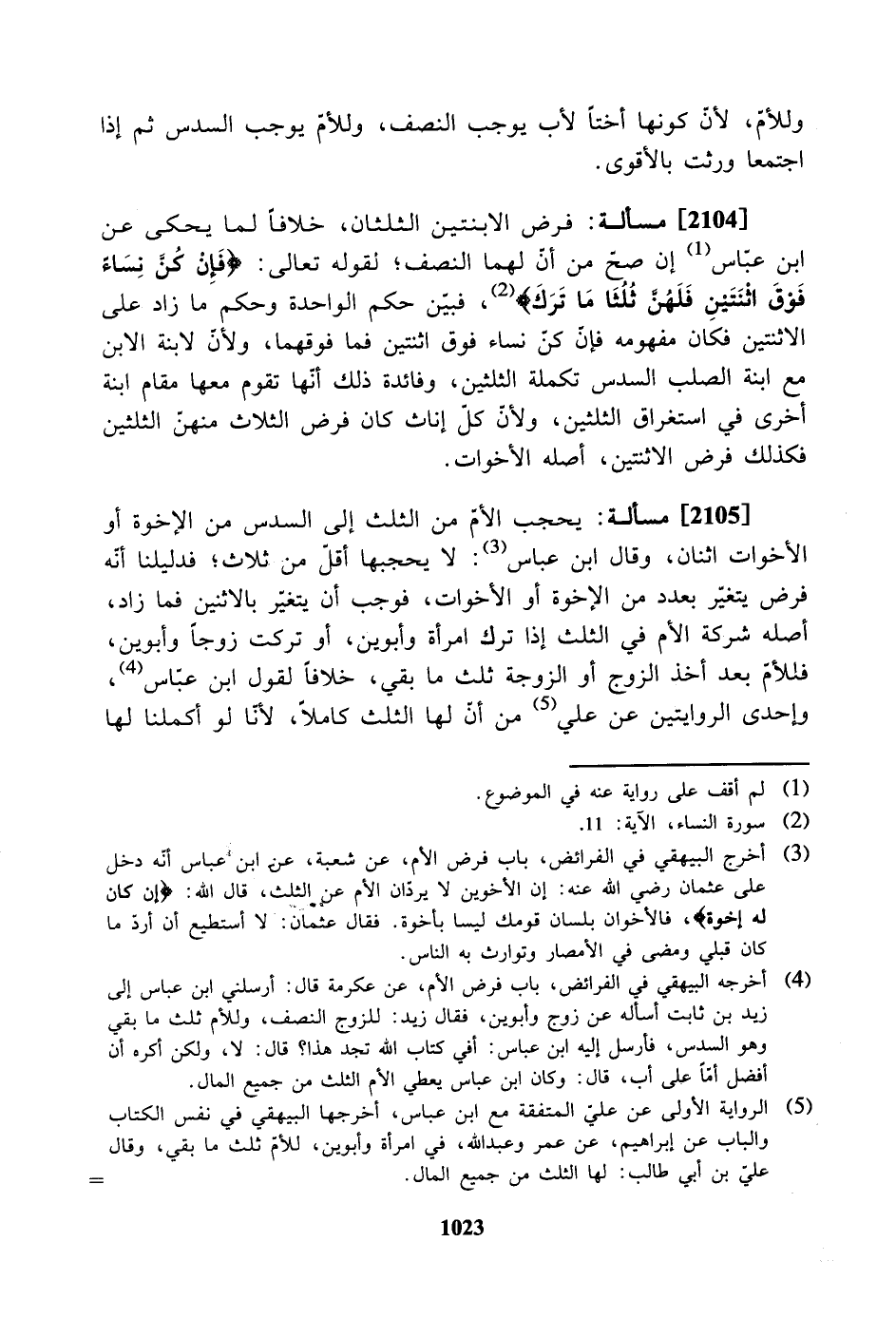 [2104] مسألة: فرض الابنتين الثلثان، خلافاً لما يحكى عن ابن عباس إن صحّ من أن لهما النصف؛ لقوله تعالى: "فإن كن نساء فوق اثنتين فلهن ثلثا ما ترك"، فبين حكم الواحدة وحكم ما زاد على الاثنتين فكان مفهومه فإن كن نساء فوق اثنتين فما فوقهما، ولأن لابنة الابن مع ابنة الصلب السدس تكملة الثلثين، وفائدة ذلك أنّها تقوم معها مقام ابنة أخرى في استغراق الثلثين، ولأن كل إناث كان فرض الثلاث منهن الثلثين فكذلك فرض الاثنتين، أصله الأخوات.