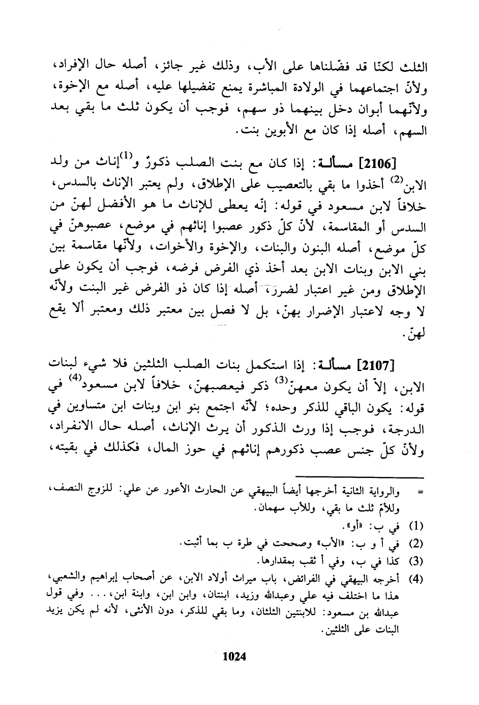 [2106] مسألة: إذا كان مع بنت الصلب ذكور وإناث من ولد الابن أخذوا ما بقي بالتعصيب على الإطلاق، ولم يعتبر الإناث بالسدس، خلافاً لابن مسعود في قوله: إنه يعطى للإناث ما هو الأفضل لهن من السدس أو المقاسمة، لأن كل ذكور عصبوا إناثهم في موضع، عصبوهن في كل موضع، أصله البنون والبنات، والإخوة والأخوات، ولأنها مقاسمة بين بني الابن وبنات الابن بعد أخذ ذي الفرض فرضه، فوجب أن يكون على الإطلاق ومن غير اعتبار لضرر، أصله إذا كان ذو الفرض غير البنت ولأنه لا وجه لاعتبار الإضرار بهن، بل لا فصل بين معتبر ذلك ومعتبر ألا يقع لهن.