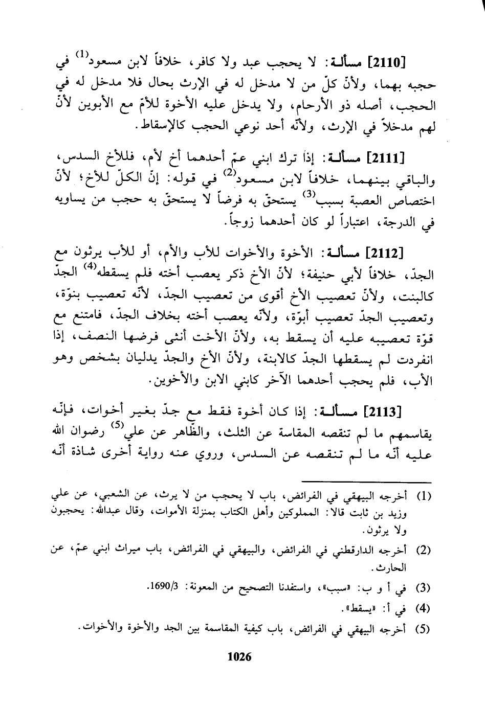 [2111] مسألة: إذا ترك ابني عم أحدهما أخ لأم، فللأخ السدس، والباقي بينهما، خلافاً لابن مسعود في قوله: إن الكل للأخ؛ لأن اختصاص العصبة بسبب يستحق به فرضاً لا يستحق به حجب من يساويه في الدرجة، اعتبارًا لو كان أحدهما زوجاً.