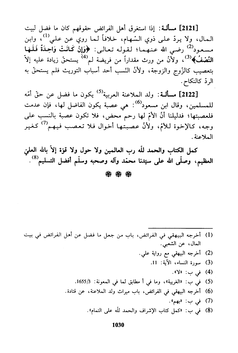 [2121] مسألة: إذا استغرق أهل الفرائض حقوقهم كان ما فضل لبيت المال، ولا يرد على ذوي السهام، خلافاً لما روي عن علي، وابن مسعود رضي الله عنهما؛ لقوله تعالى: "وإن كانت واحدة فلها النصف"، ولأن من ورث مقداراً من فريضة لم يستحق زيادة عليه إلا بتعصيب كالزوج والزوجة، ولأن النسب أحد أسباب التوريث فلم يستحق به الرد كالنكاح.