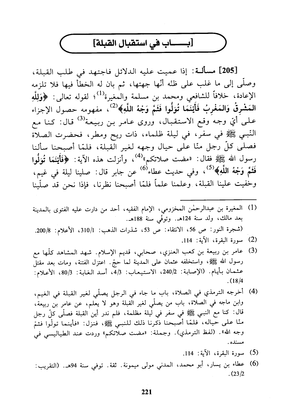 [205] مسألة: إذا عميت عليه الدلائل فاجتهد في طلب القبلة وصلى إلى ما غلب على ظنه أنها جهتها ثم بان له الخطأ فيها فلا تلزمه الإعادة، خلافا للشافعيومحمد بن مسلمة والمغيرة لقوله تعالى: {ولله المشرق والمغرب فأينما تولوا فثم وجه الله} مفهومه: حصول الأجزاء على أي وجه وقع الاستقبال، وروى عامر بن ربيعة قال: كنا مع النبي - صلى الله عليه وسلم - في سفر في ليلة ظلماء ذات ريح ومطر فحضرت الصلاة فصلى كل رجل منا على حيال وجهه لغير القبلة فلما أصبحنا سألنا رسول الله - صلى الله عليه وسلم - فقال (مضت صلاتكم) وأنزلت هذه الآية: {فأينما تولوا فثم وجه الله} وفي حديث عطاء، عن جابر قال: صلينا ليلة في غيم وخفيت علينا القبلة، وَعَلَّمْنَا عَلَمَاً، فلما أصبحنا نظرنا، فإذا نحن قد صلينا