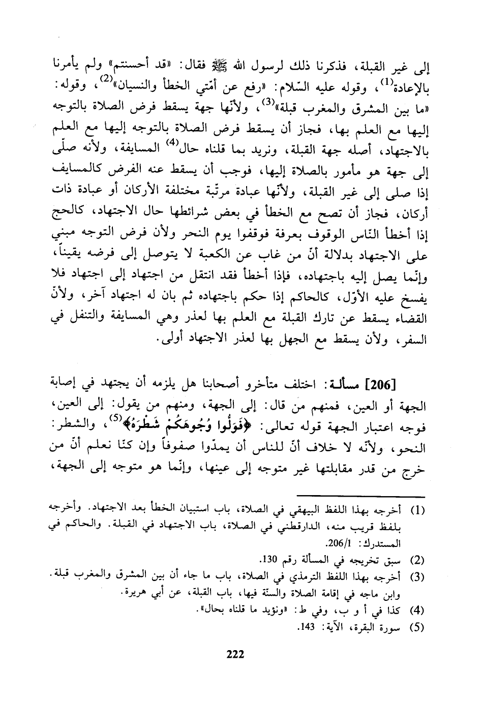 [206] مسألة: اختلف متأخرو أصحابنا، هل يلزمه أن يجتهد في إصابة الجهة أو العين، فمنهم من قال: إلى الجهة، ومنهم من يقول: إلى العين، فوجه اعتبار الجهة قوله تعالى: {فولوا وجوهكم شطره} والشطر النحو، ولأنه لا خلاف أن للناس أن يمدوا صفوفا، وإن كنا نعلم أن من خرج من قدر مقابلتها غير متوجه إلى عينها، وإنما هو متوجه إلى الجهة،