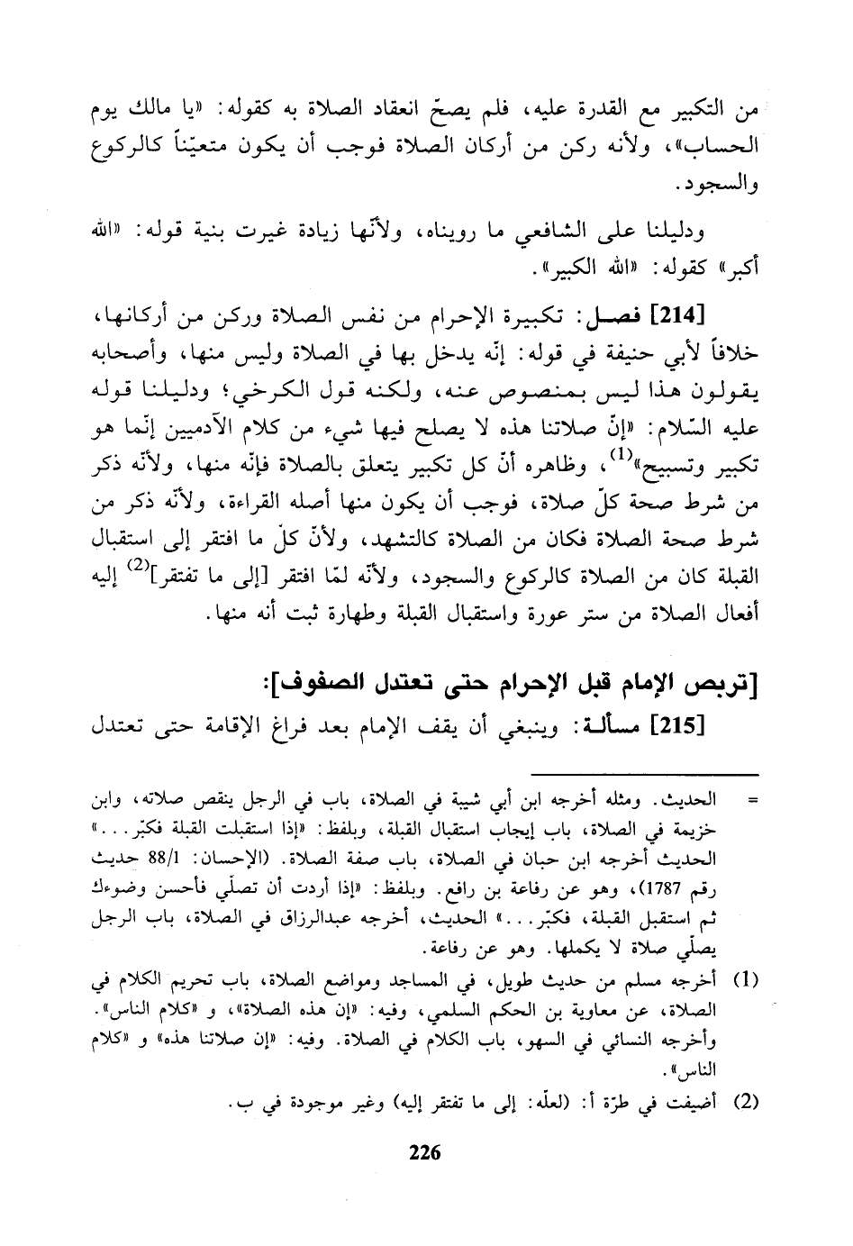 [214] (فصل): تكبيرة الإحرام من نفس الصلاة وركن من أركانها، خلافا لأبي حنيفة في قوله: إنه يدخل بها في الصلاة وليس منها، وأصحابه يقولون: هذا ليس بمنصوص عنه ولكنه قول الكرخيودليلنا قوله عليه الصلاة والسلام: (إن صلاتنا هذه لا يصلح فيها شيء من كلام الآدميين، إنما هو تكبير وتسبيح) وظاهره أن كل تكبير يتعلق بالصلاة فإنه منها، ولأنه ذكر من شرط صحة كل صلاة فوجب أن يكون منها، أصله القراءة، ولأنه ذكر من شرط صحة الصلاة فكان من الصلاة كالتشهد، ولأن كل ما افتقر إلى استقبال القبلة كان من الصلاة كالركوع والسجود ولأن كل ما افتقر إليه أفعال الصلاة من ستر العورة واستقبال القبلة وطهارة، ثبت أنه منها.