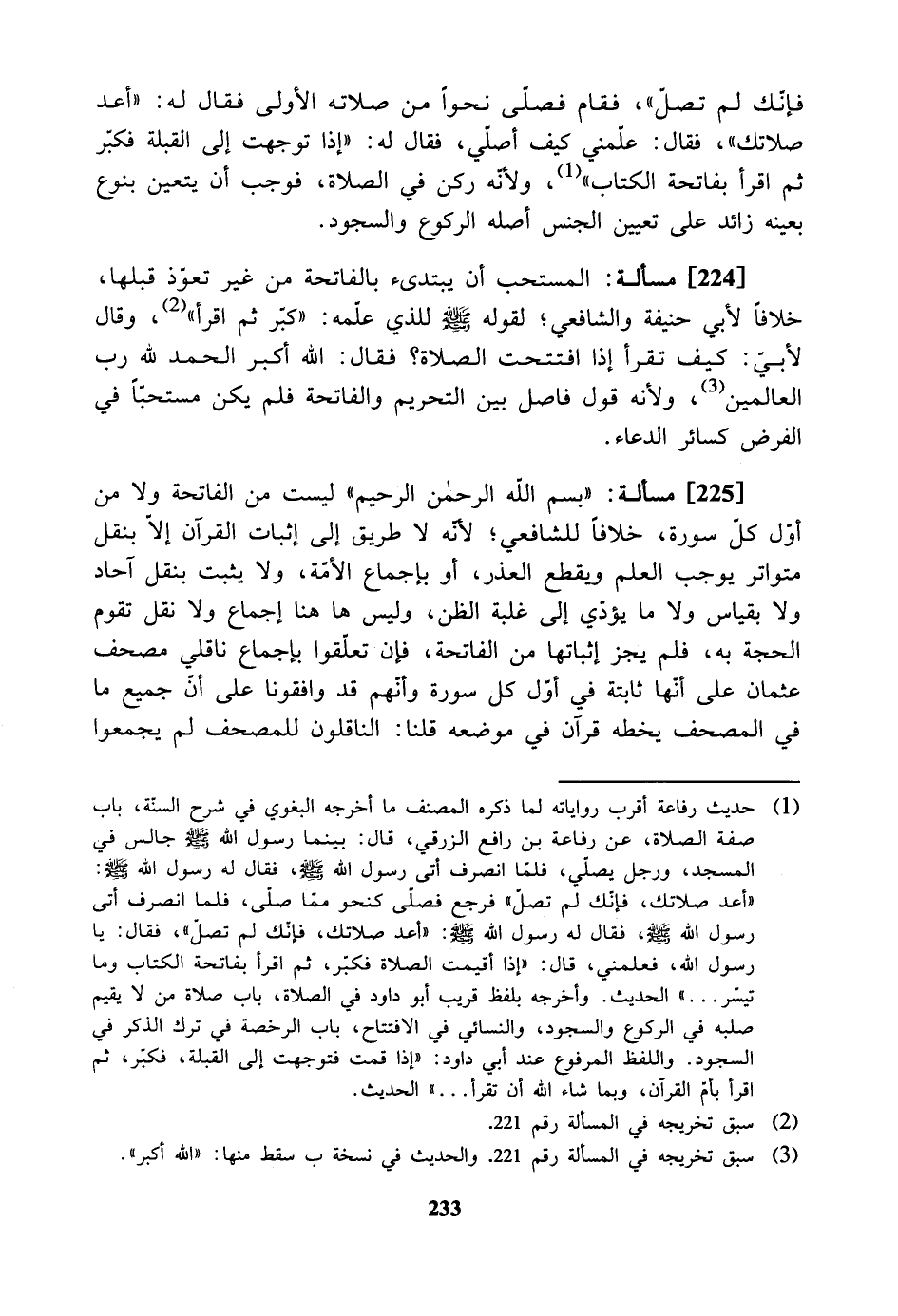 [225] مسألة: (بسم الله الرحمن الرحيم) ليست من الفاتحة ولا من أول كل سورة خلافاً للشافعي: لأنه لا طريق إلى إثبات القرآن إلا بنقل متواتر يوجب العلم ويقطع العذر، أو بإجماع الأمة ولا يثبت بنقل أحاد ولا بقياس ولا ما يؤدي إلى غلبة الظن، وليس هاهنا إجماع ولا نقل تقوم الحجة به فلم يجز إثباتها من الفاتحة. وإن تعلقوا بإجماع ناقلي مصحف عثمان على أنها ثابتة في أول كل سورة، وأنهم قد وافقونا على أن جميع ما في المصحف بخطه قرآن في موضعه، قلنا: الناقلون للمصحف لم يجمعوا