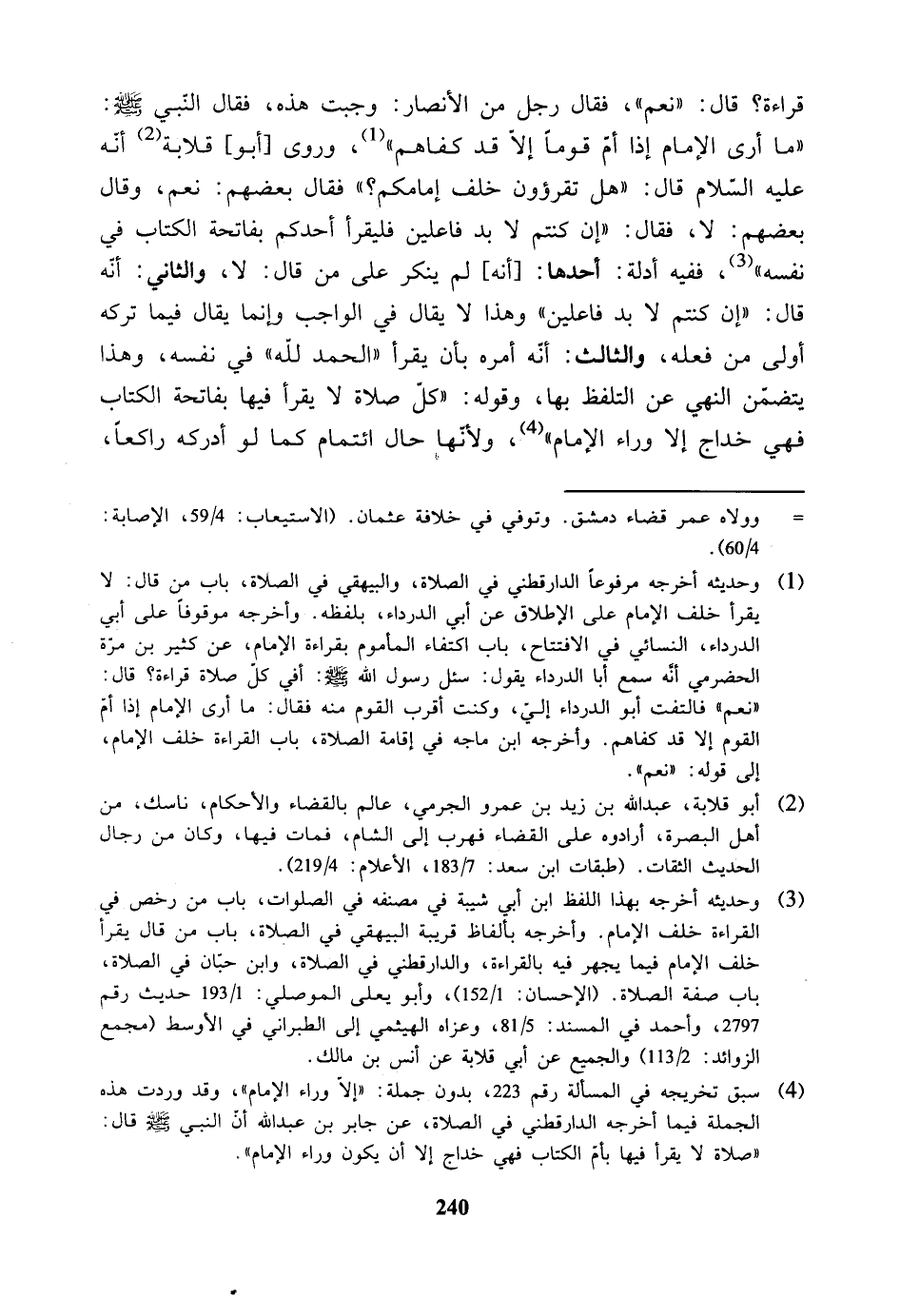 قراءة؟ قال: نعم فقال رجل من الأنصار وجبت هذه. فقال النبي - صلى الله عليه وسلم - (ما أرى الإمام إذا أم قوماً إلا قد كفاهم).وروى أبو قلابة أنه عليه السلام قال: (هل تقرؤون خلف إمامكم؟ قال بعضهم: نعم وقال بعضهم: لا، فقال إن كنتم لابد فاعلين فليقرأ أحدكم بفاتحة الكتاب في نفسه).
