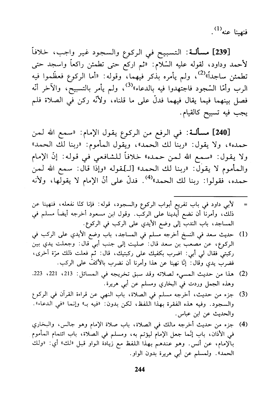[239] مسألة: التسبيح في الركوع والسجود غير واجب خلافاً لأحمد وداود. لقوله عليه السلام: (ثم اركع حتى تطمئن راكعاً واسجد حتى تطمئن ساجداً) ولم يأمره بذكر فيهما. وقوله: (أما الركوع فعظموا فيه الرب، وأما السجود فاجتهدوا فيه بالدعاء) ولم يأمره بالتسبيح، والآخر أنه فصل بينهما فيما يقال فيهما فدل على ما قلناه. ولأنه ركن في الصلاة فلم يجب فيه تسبيح كالقيام.