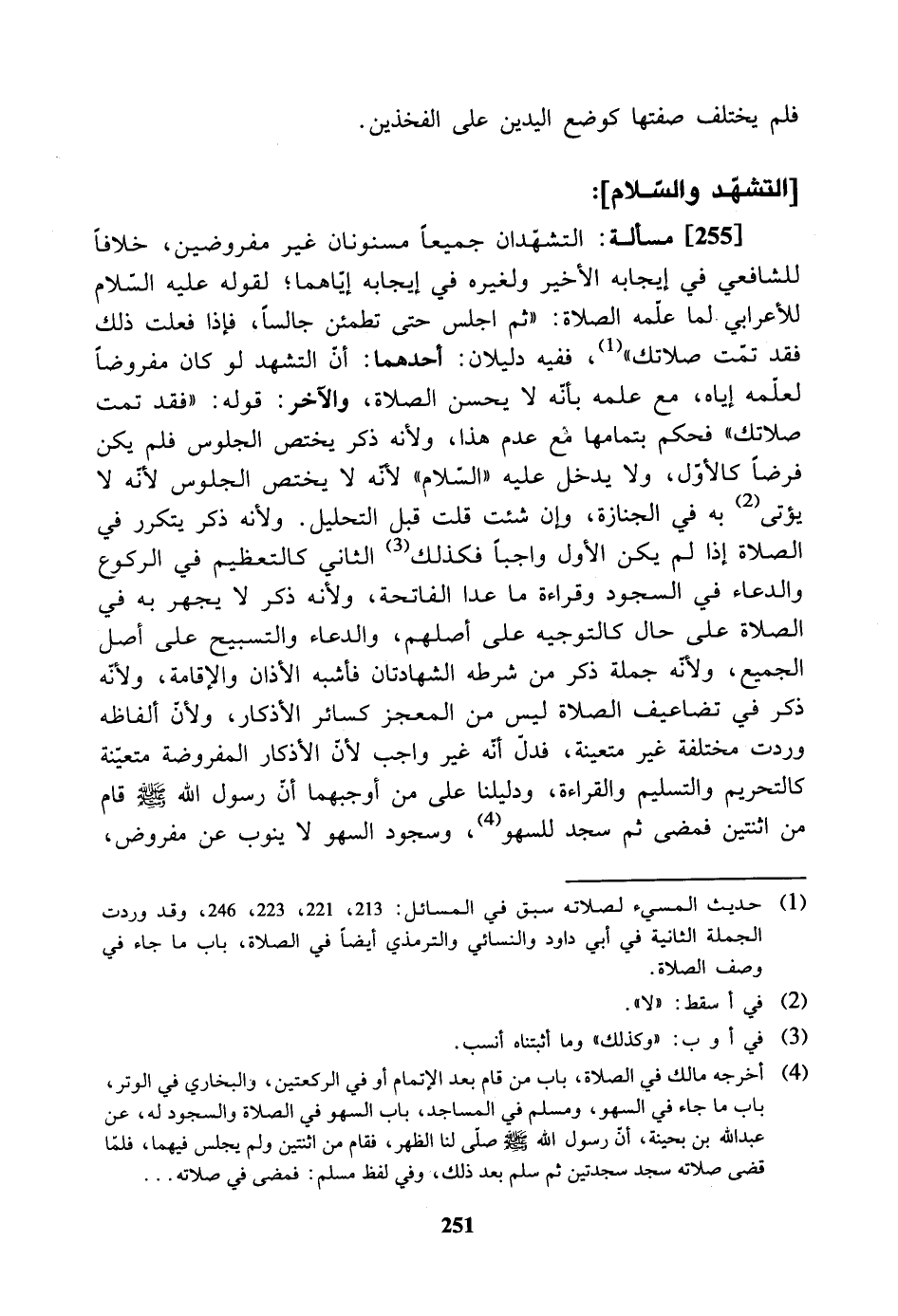 [255] مسألة: التشهدان جميعاً مسنونان غير مفروضين. خلافاً للشافعي في إيجابه الأخير ولغيره في إيجابه إياهما لقوله عليه السلام للأعرابي لما علمه الصلاة: (ثم اجلس حتى تطمئن جالساً فإذا فعلت ذلك فقد تمت صلاتك) ففيه دليلان: أحدهما: أن التشهد لو كان مفروضاً لعلمه إياه مع علمه بأنه لا يحسن الصلاة. والآخر: قوله (فقد تمت صلاتك) فحكم بتمامها مع عدم هذا ولأنه ذكر يختص بالجلوس فلم يكن فرضاً كالأول، ولا يدخل عليه السلام؛ لأنه لا يختص بالجلوس؛ لأنه يؤتى به في الجنازة، وإن شئت قلت قبل التحليل. ولأنه ذكر يتكرر في الصلاة إذا لم يكن الأول واجباً فكذلك الثاني كالتعظيم في الركوع، والدعاء في السجود، وقراءة ما عدا الفاتحة. ولأنه ذكر لا يجهر به في الصلاة على حال كالتوجيه على أصلهم والدعاء على أصل الجميع. ولأنه جملة ذكر من شرطه الشهادتان فأشبه الأذان والإقامة، ولأنه ذكر في تضاعيف الصلاة ليس من المعجز كسائر الأذكار، ولأن ألفاظه وردت مختلفة غير متعينة فدل أنه غير واجب، لأن الأذكار المفروضة متعينة كالتحريم والتسليم والقراءة، ودليلنا على من أوجبهما أن رسول الله - صلى الله عليه وسلم - قام من اثنتين فمضى ثم سجد للسهو وسجود السهو لا ينوب عن مفروض