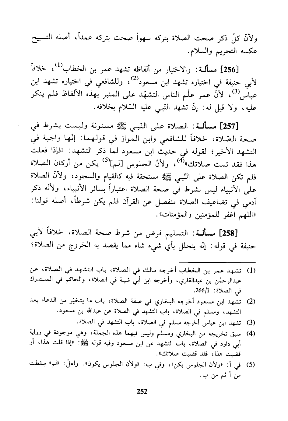 [257] مسألة: الصلاة على النبي - صلى الله عليه وسلم - مسنونة وليست بشرط في صحة الصلاة خلافاً للشافعي وابن المواز في قولهما إنها واجبة في التشهد الأخير. لقوله في حديث ابن مسعود لما ذكر التشهد: (فإذا فعلت هذا فقد تمت صلاتك) ولأن الجلوس لم يكن من أركان الصلاة فلم تكن الصلاة على النبي - صلى الله عليه وسلم - مستحقة فيه كالقيام والسجود. ولأن الصلاة على الأنبياء ليس بشرط في صحة الصلاة اعتباراً بسائر الأنبياء. ولأنه ذكر آدمي في تضاعيف الصلاة منفصل عن القرآن فلم يكن شرطاً أصله قولنا: اللهم اغفر للمؤمنين والمؤمنات.