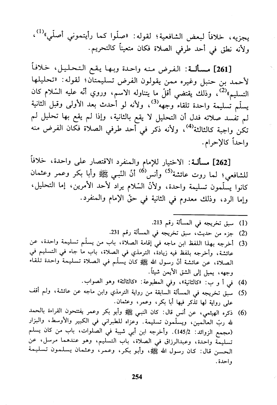 [262] مسألة: الاختيار للإمام والمنفرد الاقتصار على واحدة خلافاً للشافعي. لما روت عائشة وأنس أن النبي - صلى الله عليه وسلم - وأبا بكر وعمر وعثمان كانوا يسلمون تسليمة واحدة. ولأن السلام يراد لأحد أمرين إما التحليل وإما الرد وذلك معدوم في الثانية في حق الإمام والمنفرد.