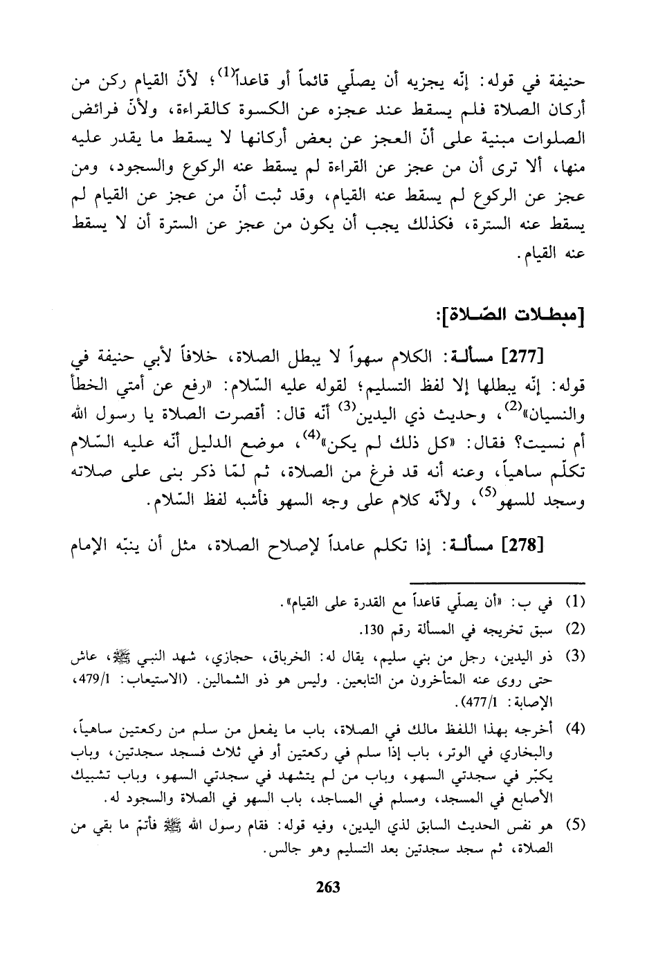 [277] مسألة: الكلام سهواً لا يبطل الصلاة. خلافاً لأبي حنيفة في قوله إنه يبطلها إلا لفظ التسليم. لقوله عليه السلام: (رفع عن أمتي الخطأ والنسيان)، وحديث ذي اليدين أنه قال: أقصرت الصلاة يا رسول الله أم نسيت؟ فقال: (كل ذلك لم يكن) موضع الدليل أنه عليه السلام تكلم ساهياً وعنده أنه قد فرغ من الصلاة ثم لما ذكر بنى على صلاته وسجد للسهو. ولأنه كلام على وجه السهو فأشبه لفظ السلام.
