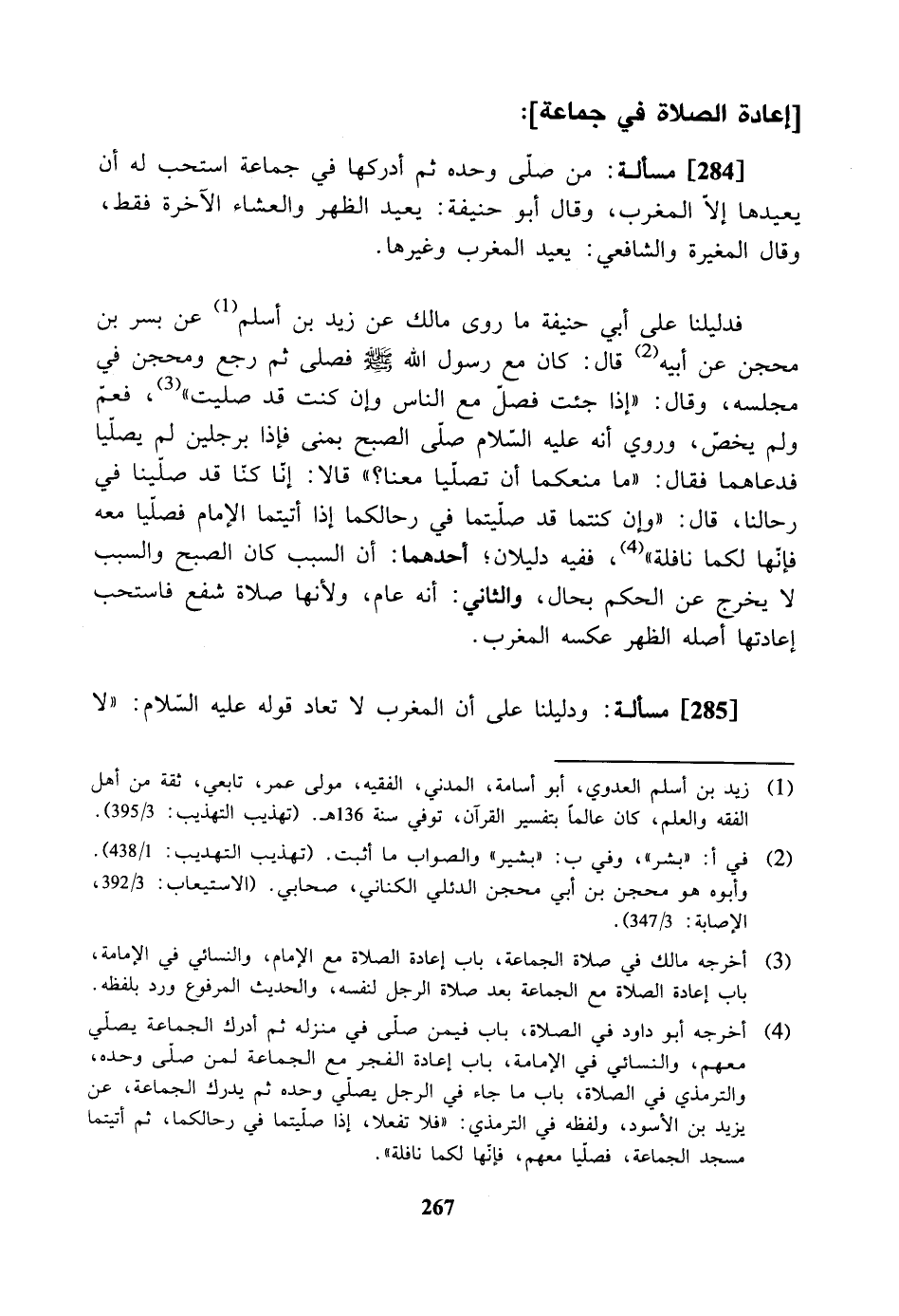 [284] مسألة: من صلى وحده ثم أدركها في جماعة استحب له أن يعيدها إلا المغرب. وقال أبو حنيفة يعيد الظهر والعشاء الأخيرة فقط وقال المغيرة والشافعي يعيد المغرب وغيرها. فدليلنا على أبي حنيفة ما روى مالك عن زيد بن أسلم عن بشر بن محجن عن أبيه قال: (كنا مع رسول الله - صلى الله عليه وسلم - فصلى ثم رجع ومحجن في مجلسه وقال: إذا جئت فصل مع الناس وإن كنت قد صليت) فعم ولم يخص. وروي أنه عليه السلام صلى الصبح بمنى وإذا برجلين لم يصليا فدعاهما فقال: (ما منعكما أن تصليا معنا، قالا: إنا كنا قد صلينا في رحالنا، قال: وإن كنتما قد صليتما في رحالكما إذا أتيتما الإمام فصليا معه فإنها لكما نافلة) ففيه دليلان: أحدهما: أن السبب كان الصبح، والسبب لا يخرج عن الحكم بحال. والثاني: أنه عام. ولأنها صلاة شفع فاستحب إعادتها أصله الظهر عكسه المغرب.