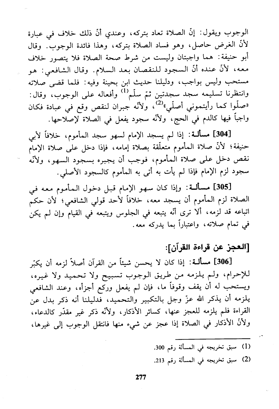 [305] مسألة: وإذا كان سهو الإمام قبل دخول المأموم معه في الصلاة لزم المأموم أن يسجد معه. خلافاً لأحد قولي الشافعي. لأن حكم اتباعه قد لزمه، ألا ترى أنه يتبعه في الجلوس ويتبعه في القيام، وإن لم يكن في نظام صلاته، واعتباراً بما يدركه معه.