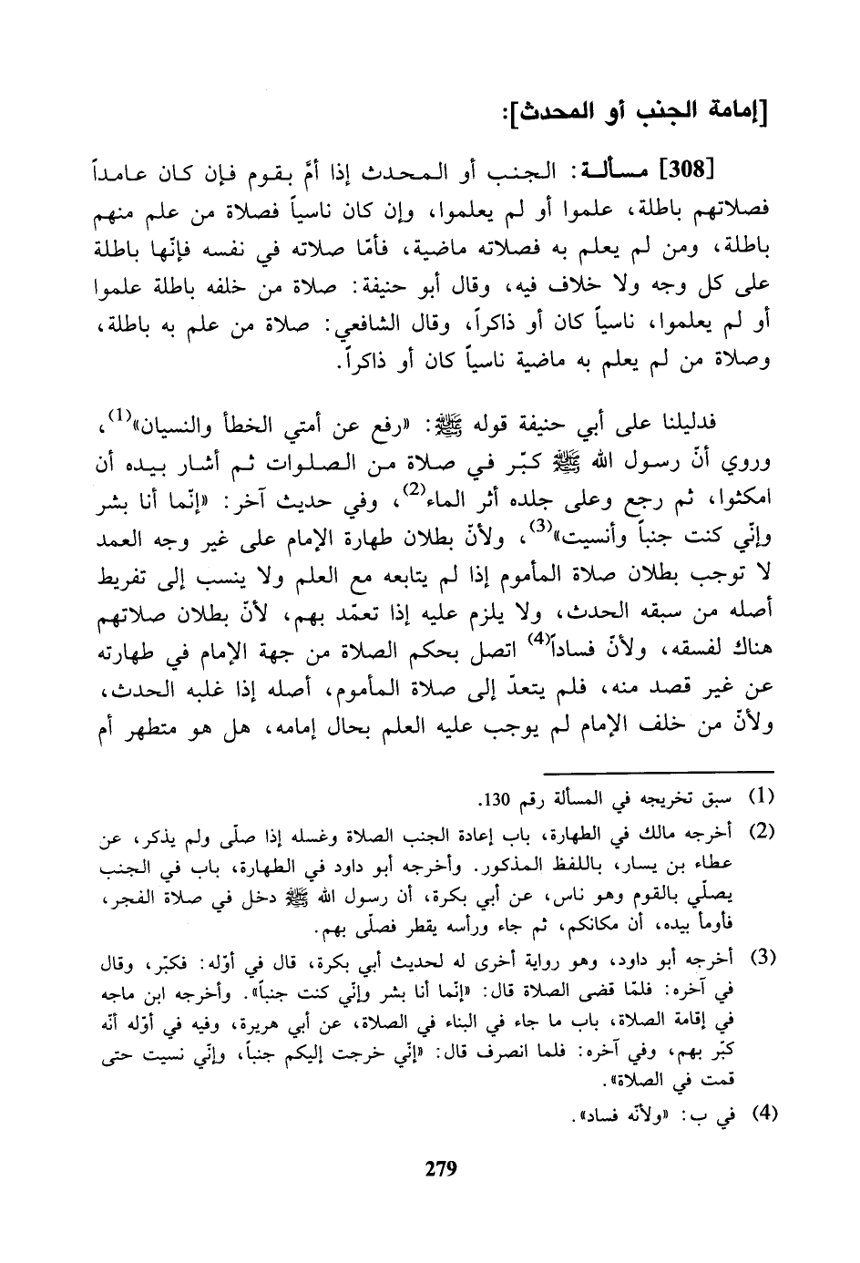 [308] مسألة: الجنب أو المحدث إذا أم بقوم، فإن كان عامداً فصلاتهم باطلة علموا أو لم يعلموا وإن كان ناسياً، فصلاة من علم منهم باطلة، ومن لم يعلم به فصلاته ماضية، فأما صلاته في نفسه، فإنها باطلة على كل وجه ولا خلاف فيه. وقال أبو حنيفة: صلاة من خلفه باطلة علموا أو لم يعلموا ناسياً كان أو ذاكراً. وقال الشافعي: صلاة من علم به باطلة، وصلاة من لم يعلم به ماضية ناسياً كان أو ذاكراً. فدليلنا على أبي حنيفة قوله - صلى الله عليه وسلم -: (رفع عن أمتي الخطأ والنسيان) وروي أن رسول الله - صلى الله عليه وسلم - كبر في صلاة من الصلوات، ثم أشار بيده أن امكثوا، ثم رجع وعلى جلده أثر الماء. وفي حديث آخر: (إنما أنا بشر وإني كنت جنباً وأنسيت). ولأن بطلان طهارة الإمام على غير وجه العمد لا توجب بطلان صلاة المأموم إذا لم يتابعه مع العلم، ولا ينسب إلى تفريط، أصله من سبقه الحدث، ولا يلزم عليه إذا تعمد بهم لأن بطلان صلاتهم هناك لفسقه. ولأنه فساد اتصل بحكم الصلاة من جهة الإمام في طهارته عن غير قصد منه فلم يتعد إلى صلاة المأموم، أصله إذا غلبه الحدث. ولأن من خلف الإمام لا يجب عليه العلم بحال إمامه هل هو متطهر أو