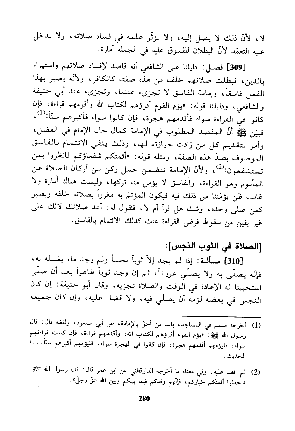 [309] (فصل): دليلنا على الشافعي أنه قاصد لإفساد صلاتهم، واستهزاء بالدين فبطلت صلاتهم خلف من هذه صفته كالكافر. ولأنه يصير بهذا الفعل فاسقا وإمامة الفاسق لا تجزئ عندنا وتجزئ عند أبي حنيفة والشافعي. ودليلنا قوله: (يؤمّ القوم أقرؤهم لكتاب الله وأقومهم قراءة، فإن كانوا في القراءة سواء فأقدمهم هجرة، فإن كانوا سواء فأكبرهم سنا) فبين - صلى الله عليه وسلم - أن المقصد المطلوب في الإمامة كمال حال الإمام في الفضل، وأمر بتقديم كل من زادت حيازته لها، وذلك ينفي الائتمام بالفاسق الموصوف بضد هذه الصفة. ومثله قوله (أئمتكم شفعاؤكم، فانظروا بمن تستشفعون). ولأن الإمامة تتضمن حمل ركن من أركان الصلاة عن المأموم وهو القراءة، والفاسق لا يؤمن منه تركها، وليست هناك إمارة ولا غالب ظن يؤمّننا من ذلك فيه، فيكون المؤتم به مغرراً بصلاته خلفه ويصير كمن صلى وحده وشك هل قرأ أم لا فنقول له أعد صلاتك؛ لأنك على غير يقين من سقوط فرض القراءة عنك، كذلك الائتمام بالفاسق.