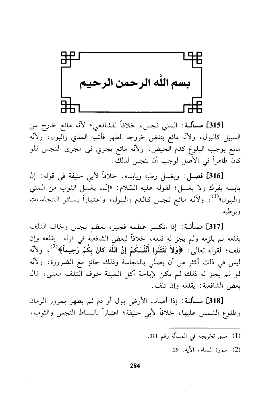 [317] مسألة: إذا انكسر عظمه فجبر بعظم نجس، وخاف التلف بقلعه لم يلزمه ولم يجز له قلعه. خلافاً لبعض الشافعية في قوله يقلعه وإن تلف لقوله تعالى: {ولا تقتلوا أنفسكم إن الله كان بكم رحيما} ولأنه ليس في ذلك أكثر من أن يصلي بالنجاسة، وذلك جائز مع الضرورة. ولأنه لو لم يجز له ذلك لم يكن لإباحة أكل الميتة خوف التلف معنى، قال بعض الشافعية: يقلعه وإن تلف.
