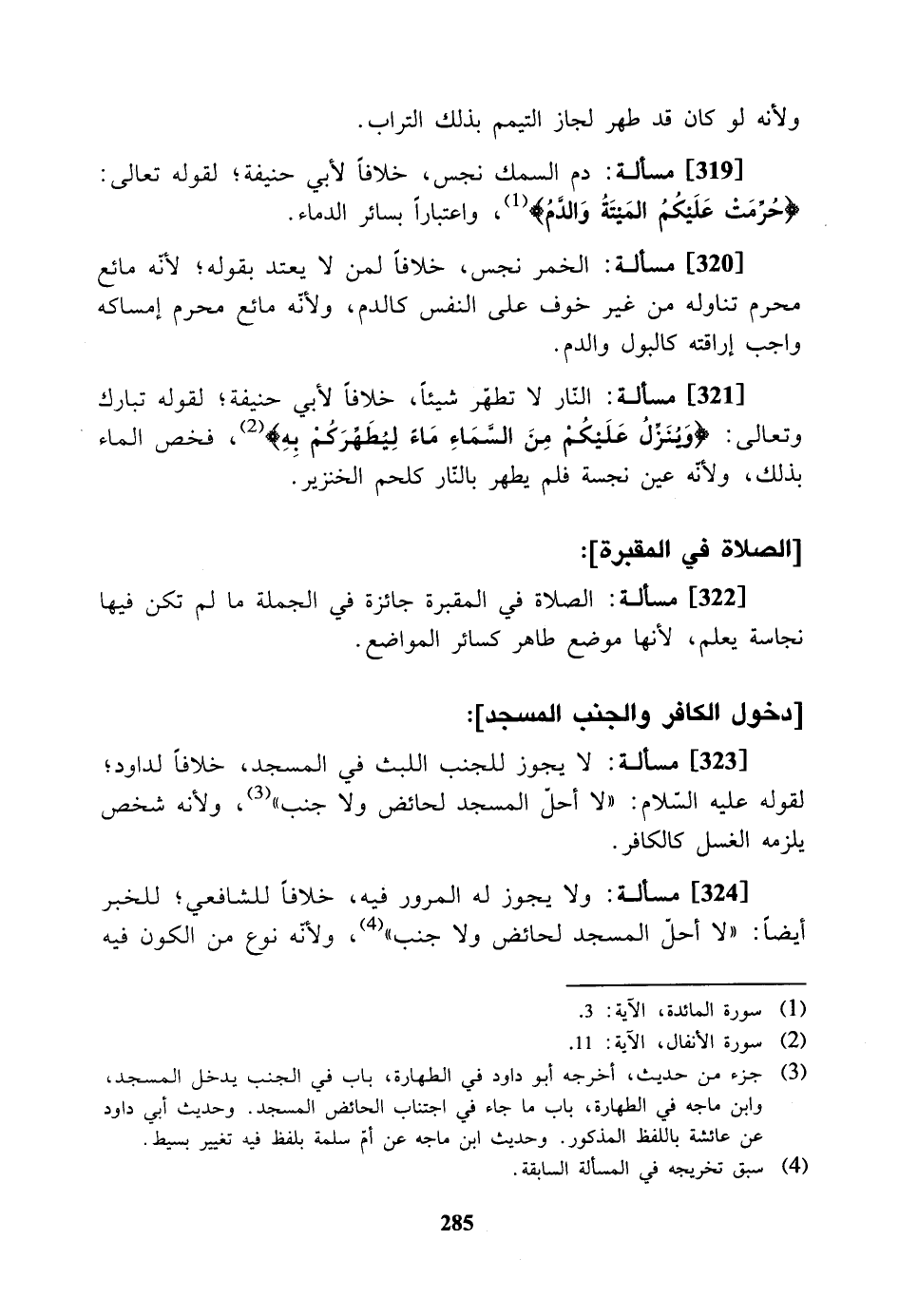 [322] مسألة: الصلاة في المقبرة جائزة في الجملة ما لم تكن فيها نجاسة تعلم،. لأنها موضع طاهر كسائر المواضع.