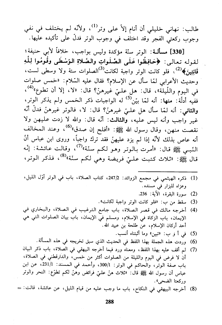 [330] مسألة: الوتر سنة مؤكدة وليس بواجب. خلافاً لأبي حنيفة. لقوله تعالى: {حافظوا على الصلوات والصلاة الوسطى وقوموا لله قانتين} فلو كانت الوتر واجبة لكانت الصلوات ستاً ولا وسطى لست، وحديث الأعرابي لما سأل عن الإسلام فقال عليه السلام: (خمس صلوات في اليوم والليلة قال هل علي غيرهن؟ قال: لا، إلا أن تطوّع) ففيه أدلة: منها: أنه لما بين له الواجبات ذكر الخمس ولم يذكر الوتر. والثاني: أنه لما سأل هل علي غيرهن؟ قال: لا، فالوتر غيرهن، فدل أنه غير واجب وأنه ليس عليه. والثالث: أنه قال: والله لا زدت عليهن ولا نقصت منهن، وقال رسول الله - صلى الله عليه وسلم -: (أفلح إن صدق) وعند المخالف أنه عاص بذلك؛ لأنه إذا لم يزد عليهن فقد ترك واجباً وروى ابن عباس أن النبي - صلى الله عليه وسلم - قال: (أمرت بالوتر وهو لكم سنة).وقالت عائشة: إنه قال - صلى الله عليه وسلم -: (ثلاث كتبت عليّ فريضة وهي لكم سنة) فذكر الوتر