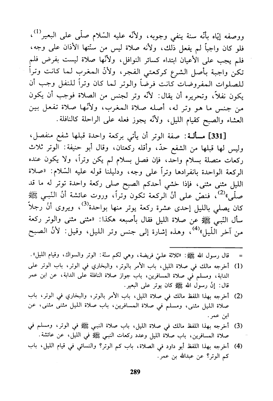 ووصفه إياه بأنه سنة، ينفي وجوبه. ولأنه عليه السلام صلاه على البعير، ولو كان واجباً لم يفعل ذلك؛ ولأنه صلاة ليس من سنتها الأذان على وجه، فلم يجب على الأعيان ابتداء كسائر النوافل. ولأنها صلاة ليست بفرض، فلم تكن واجبة بأصل الشرع كركعتي الفجر. ولأن المغرب لما كانت وتراً للصلوات المفروضات كانت فرضاً، والوتر لما كان وتراً للنفل وجب أن يكون نفلاً. وتحريره أن يقال لأنه وتر لجنس من الصلاة، فوجب أن يكون من جنس ما هو وتر له، أصله صلاة المغرب، ولأنها صلاة تفعل بين العشاء والصبح كقيام الليل، ولأنه يجوز فعله على الراحلة كالنافلة.