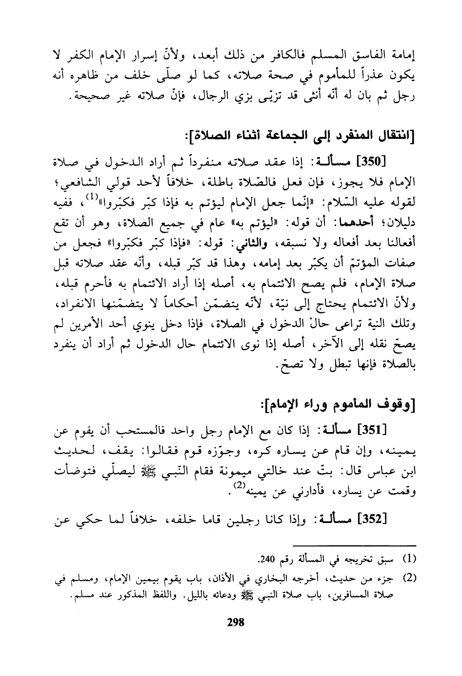 [351] مسألة: إذا كان مع الإمام رجل واحد فالمستحب أن يقوم عن يمينه وإن قام عن يساره كره وجوزه قوم فقالوا: يقف. لحديث ابن عباس قال: (بت عند خالتي ميمونة فقام النبي - صلى الله عليه وسلم - ليصلي فتوضأت وقمت عن يساره فأدارني عن يمينه).