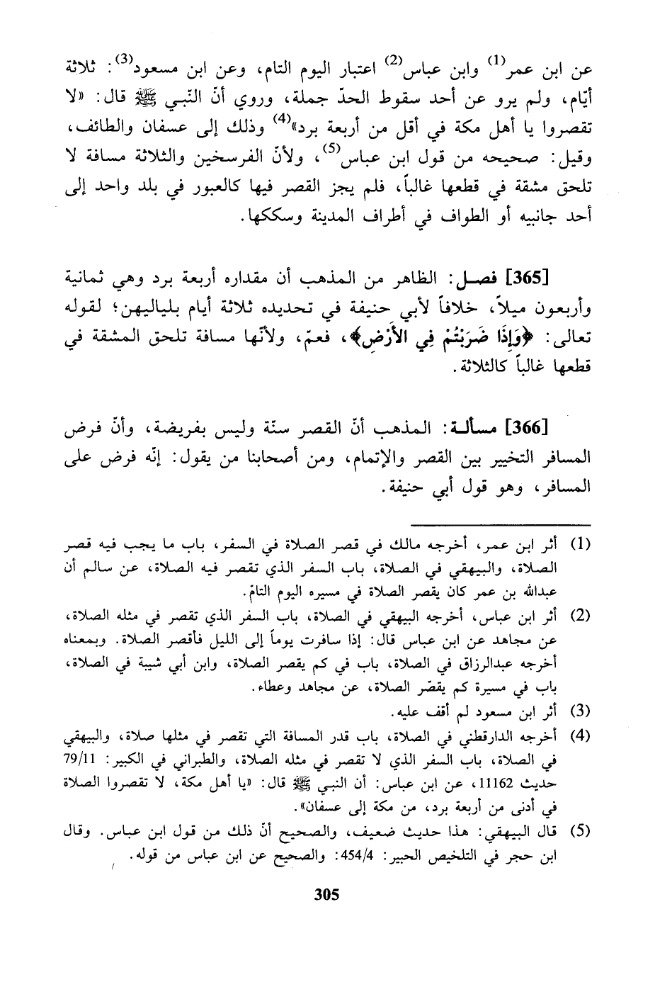 [365] (فصل): الظاهر من المذهب أن مقداره أربعة برد وهي ثمانية وأربعون ميلاً. خلافاً لأبي حنيفة في تحديد ثلاثة أيام بلياليهن، لقوله تعالى: {وإذا ضربتم في الأرض}، فعم. ولأنها مسافة تلحق المشقة في قطعها غالبا كالثلاثة.