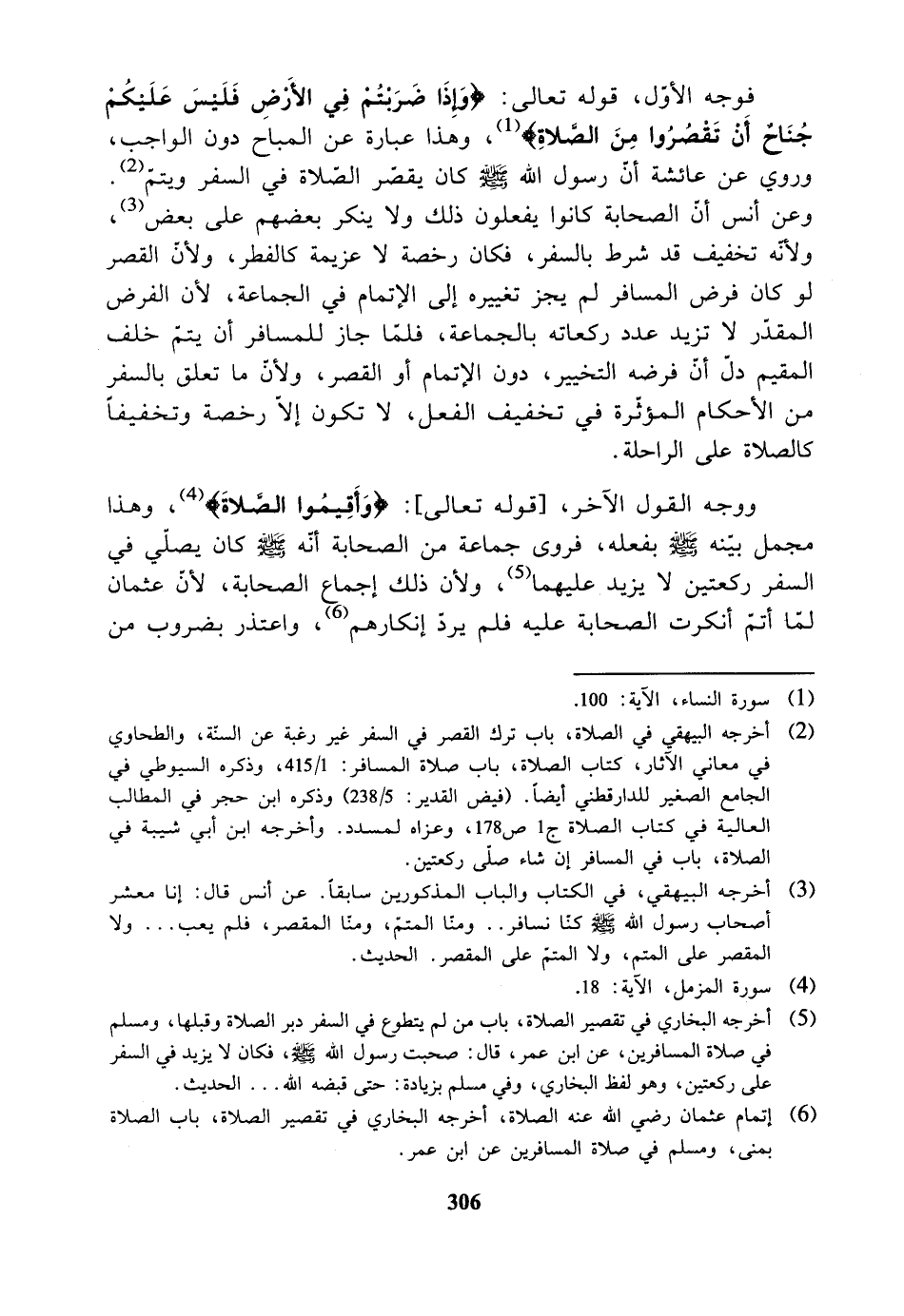 فوجه الأول قوله تعالى: {وإذا ضربتم في الأرض فليس عليكم جناح} وهذا عبارة عن المباح دون الواجب. وروي عن عائشة (أن رسول الله - صلى الله عليه وسلم - كان يقصر الصلاة في السفر ويتم). وعن أنس أن الصحابة كانوا يفعلون ذلك ولا ينكر بعضهم على بعض، ولأنه تخفيف قد شرط بالسفر فكان رخصة لا عزيمة كالفطر، ولأن القصر لو كان فرض المسافر لم يجز تغييره إلى الإتمام في الجماعة؛ لأن الفرض المقدر لا تزيد عدد ركعاته بالجماعة فلما جاز للمسافر أن يتم خلف المقيم دل على أن فرضه التخيير بين الإتمام أو القصر. ولأن ما تعلق بالسفر من الأحكام المؤثرة في تخفيف الفعل لا تكون إلا رخصة وتخفيفا، كالصلاة على الراحلة. ووجه القول الآخر: {وأقيموا الصلاة}، وهذا مجمل بينه - صلى الله عليه وسلم - بفعله فروى جماعة من الصحابة أنه - صلى الله عليه وسلم - كان يصلي في السفر ركعتين لا يزيد عليهما. ولأن ذلك إجماع الصحابة؛ لأن عثمان لما أتم أنكرت الصحابة عليه فلم يرد إنكارهم واعتذر بضروب من