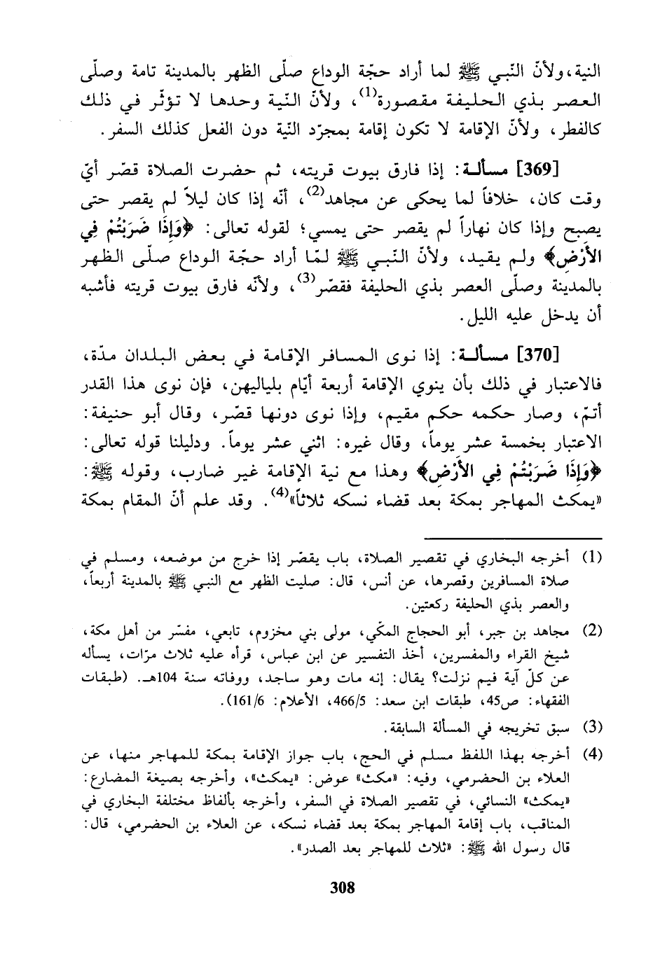[370] مسألة: إذا نوى المسافر الإقامة في بعض البلدان مدة، فالاعتبار في ذلك بأن ينوي الإقامة أربعة أيام بلياليهن، فإن نوى هذا القدر أتم وصار حكمه حكم مقيم، وإذا نوى دونها قصر. وقال أبو حنيفة الاعتبار بخمسة عشر يوماً. وقال غيره اثني عشر يوماً، ودليلنا قوله تعالى: {وإذا ضربتم في الأرض}، وهذا مع نية الإقامة غير ضارب. وقوله: - صلى الله عليه وسلم - (يمكث المهاجر بمكة بعد قضاء نسكه ثلاثاً)، وقد علم أن المقام بمكة