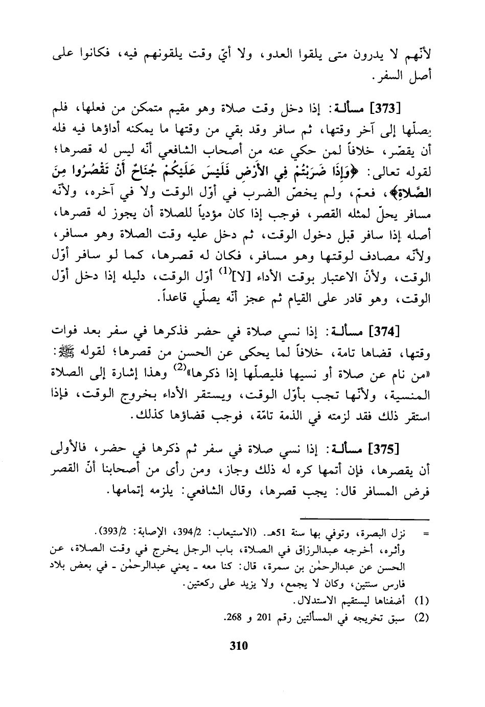 [373] مسألة: إذا دخل وقت الصلاة وهو مقيم متمكن من فعلها فلم يصلها إلى آخر وقتها ثم سافر وقد بقي من وقتها ما يمكنه أداؤها فيه فله أن يقصر. خلافاً لمن حكي عنه من أصحاب الشافعي أنه ليس له قصرها، لقوله تعالى: {وإذا ضربتم في الأرض فليس عليكم جناح أن تقصروا من الصلاة}، فعم، ولم يخص الضرب في أول الوقت ولا في آخره؛ ولأنه مسافر يحل لمثله القصر، فوجب إذا كان مؤديا للصلاة أن يجوز له قصرها، أصله إذا سافر قبل دخول الوقت ثم دخل عليه وقت الصلاة وهو مسافر. ولأنه مصادف لوقتها وهو مسافر فكان له قصرها، كما لو سافر أول الوقت. ولأنه لا اعتبار بوقت الأداء أول الوقت، دليله إذا دخل أول الوقت وهو قادر على القيام ثم عجز أنه يصلي قاعداً.