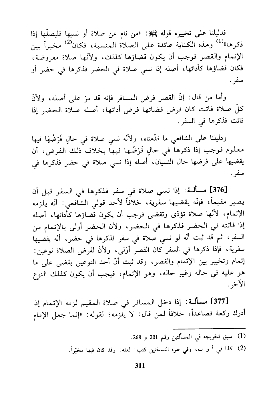 [376] مسألة: إذا نسي صلاة في سفر فذكرها في السفر قبل أن يصير مقيماً، فإنه يقضيها، سفرية. خلافاً لأحد قولي الشافعي إنه يلزمه الإتمام؛ لأنها صلاة تؤدى وتقضى، فوجب أن يكون قضاؤها كأدائها، أصله إذا فاتته في الحضر فذكرها في الحضر. ولأن الحضر أولى بالإتمام من السفر، ثم قد ثبت أنه لو نسي صلاة في سفر فذكرها في حضر أنه يقضيها سفرية فإذا ذكرها في السفر كان القصر أولى. ولأن لفرض الصلاة نوعان: إتمام، وتخيير بين الإتمام والقصر، وقد ثبت أن أحد النوعين يقضي على ما هو عليه في حاله وغير حاله وهو الإتمام، فيجب أن يكون كذلك النوع الآخر.