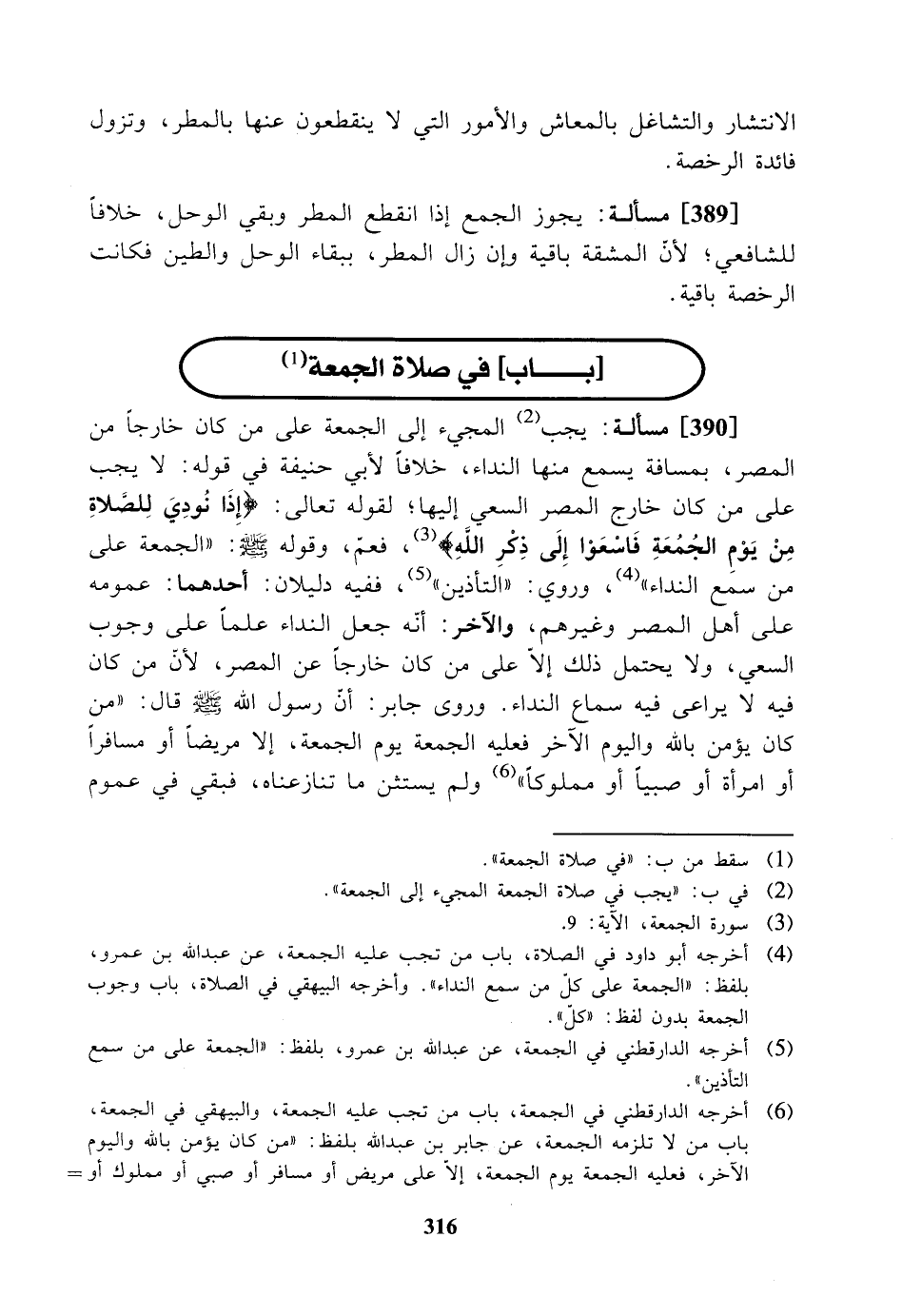 [390] مسألة: يجب في صلاة الجمعة المجيء إلى الجمعة على من كان خارجاً من المصر بمسافة يسمع منها النداء، خلافاً لأبي حنيفة في قوله لا يجب على من كان خارج المصر السعي إليها أصلاً. لقوله تعالى: {إذا نودي للصلاة من يوم الجمعة فاسعوا إلى ذكر الله}، فعم وقوله - صلى الله عليه وسلم -: (الجمعة على من سمع النداء)، وروي (التأذين)، ففيه دليلان: