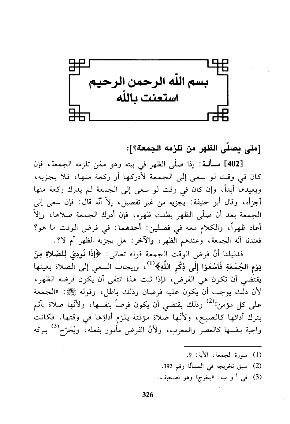 [402] مسألة: إذا صلى الظهر في بيته وهو ممن تلزمه الجمعة، فإن كان في وقت لو سعى إلى الجمعة لأدركها أو ركعةً منها فلا يجزيه، ويعيدها أبدا، وإن كان في وقت لو سعى إلى الجمعة لم يدرك ركعة منها أجزأه ,. وقال أبو حنيفة: يجزيه من غير تفصيل، إلا أنه قال: فإن سعى إلى الجمعة بعد أن صلى الظهر بطلت ظهره، فإن أدرك الجمعة صلاها، وإلا أعاد ظهراً، والكلام معه في فصلين: أحدهما: في فرض الوقت ما هو؟ فعندنا أنه الجمعة، وعندهم الظهر. والآخر: هل يجزيه الظهر أم لا؟. فدليلنا أن فرض الوقت الجمعة قوله تعالى: {إذا نودي للصلاة من يوم الجمعة فاسعوا إلى ذكر الله}، وإيجاب السعي إلى الصلاة بعينها يقتضي أن تكون هي الفرض، فإذا ثبت هذا انتفى أن يكون فرضه الظهر؛ لأن ذلك يوجب أن يكون عليه فرضان وذلك باطل، وقوله - صلى الله عليه وسلم - (الجمعة على كل مؤمن)، وذلك يقتضى أن تكون فرضاً بنفسها. ولأنها صلاة يأثم بترك أدائها كالصبح، ولأنها صلاة مؤقتة يلزم أداؤها في وقتها، فكانت واجبة بنفسها كالعصر والمغرب. ولأن الفرض مأمور بفعله، ويحرج بتركه