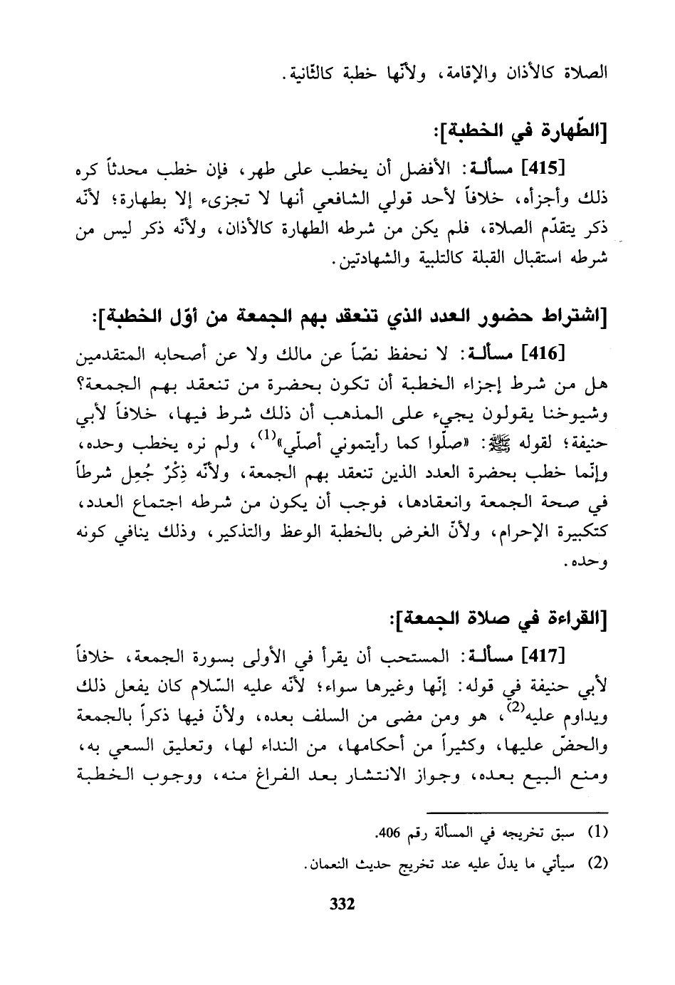 [416] مسألة: لا نحفظ نصا عن مالك ولا عن أصحابه المتقدمين هل من شرط إجزاء الخطبة أن تكون بحضرة من تنعقد بهم الجمعة وشيوخنا يقولون: يجيء على المذهب أن ذلك شرط فيها، خلافاً لأبي حنيفة. لقوله - صلى الله عليه وسلم - (صلوا كما رأيتموني أصلى)، ولم نره يخطب وحده، وإنما خطب بحضرة العدد الذين تنعقد بهم الجمعة، ولأنه ذكر جعل شرطاً في صحة الجمعة وانعقادها، فوجب أن يكون من شرطه اجتماع العدد، كتكبيرة الإحرام. ولأنه الغرض بالخطبة الوعظ والتذكير، وذلك ينافي كونه وحده.