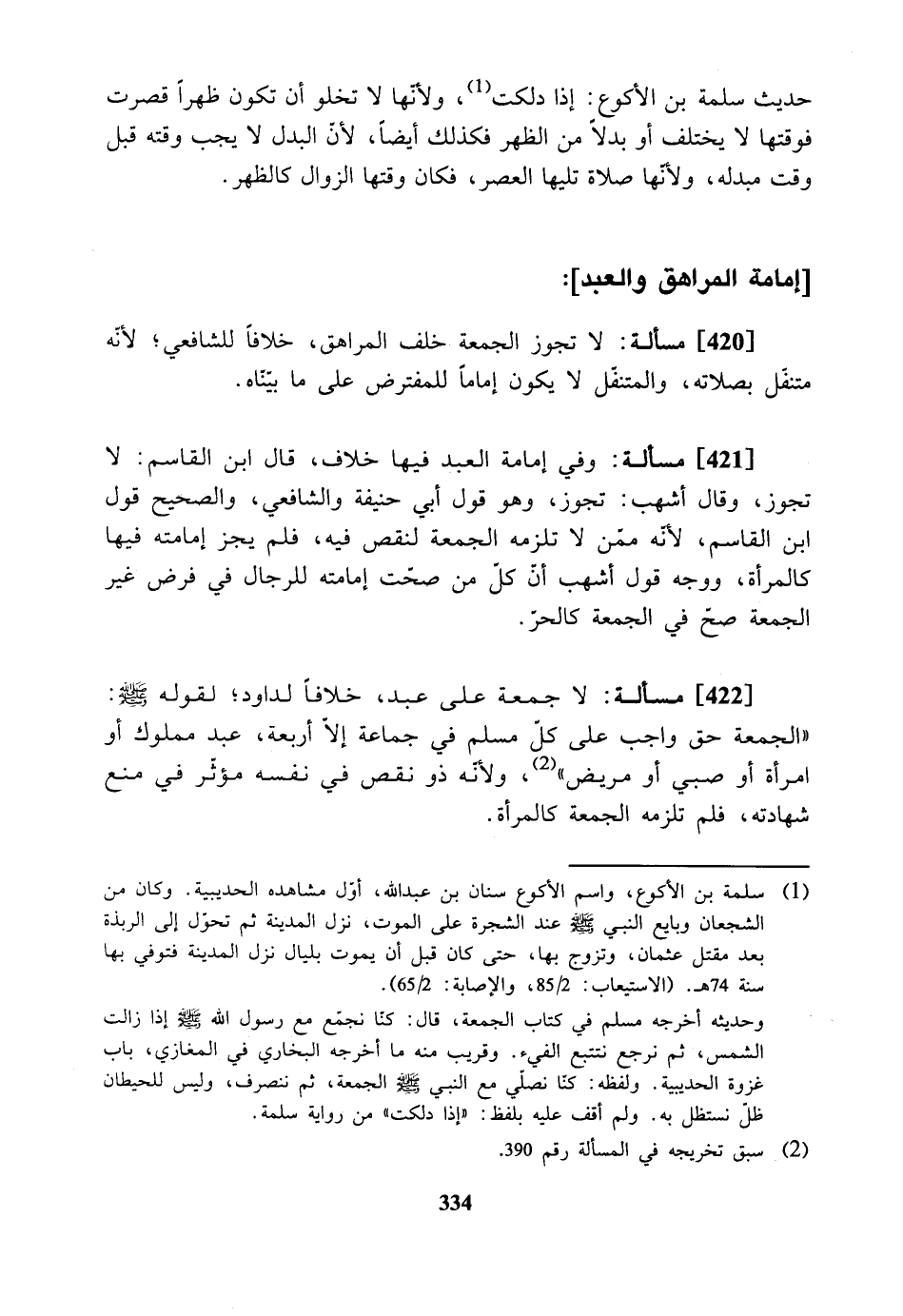 [421] مسألة: وفي إمامة العبد فيها خلاف، قال ابن القاسم: لا تجوز وقال أشهب: تجوز، وهو قول أبي حنيفة، والشافعي، والصحيح قول ابن القاسم. لأنه ممن لا تلزمه الجمعة لنقص فيه، فلم تجز إمامته فيها كالمرأة، ووجه قول أشهب أن كل من صحت إمامته للرجال في فرض غير الجمعة صح في الجمعة كالحر.