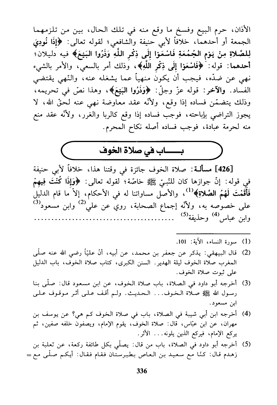 [426] مسألة: صلاة الخوف جائزة في وقتنا هذا خلافاً لأبي حنيفة في قوله: إن جوازها كان للنبي - صلى الله عليه وسلم - خاصة. لقوله تعالى: {وإذا كنت فيهم فأقمت لهم الصلاة}، والأصل مساوتنا له في الأحكام، إلا ما قام الدليل على خصوصه، ولأنه إجماع الصحابة وروي عن علي، وابن مسعود، وابن عباس، وحذيفة .......