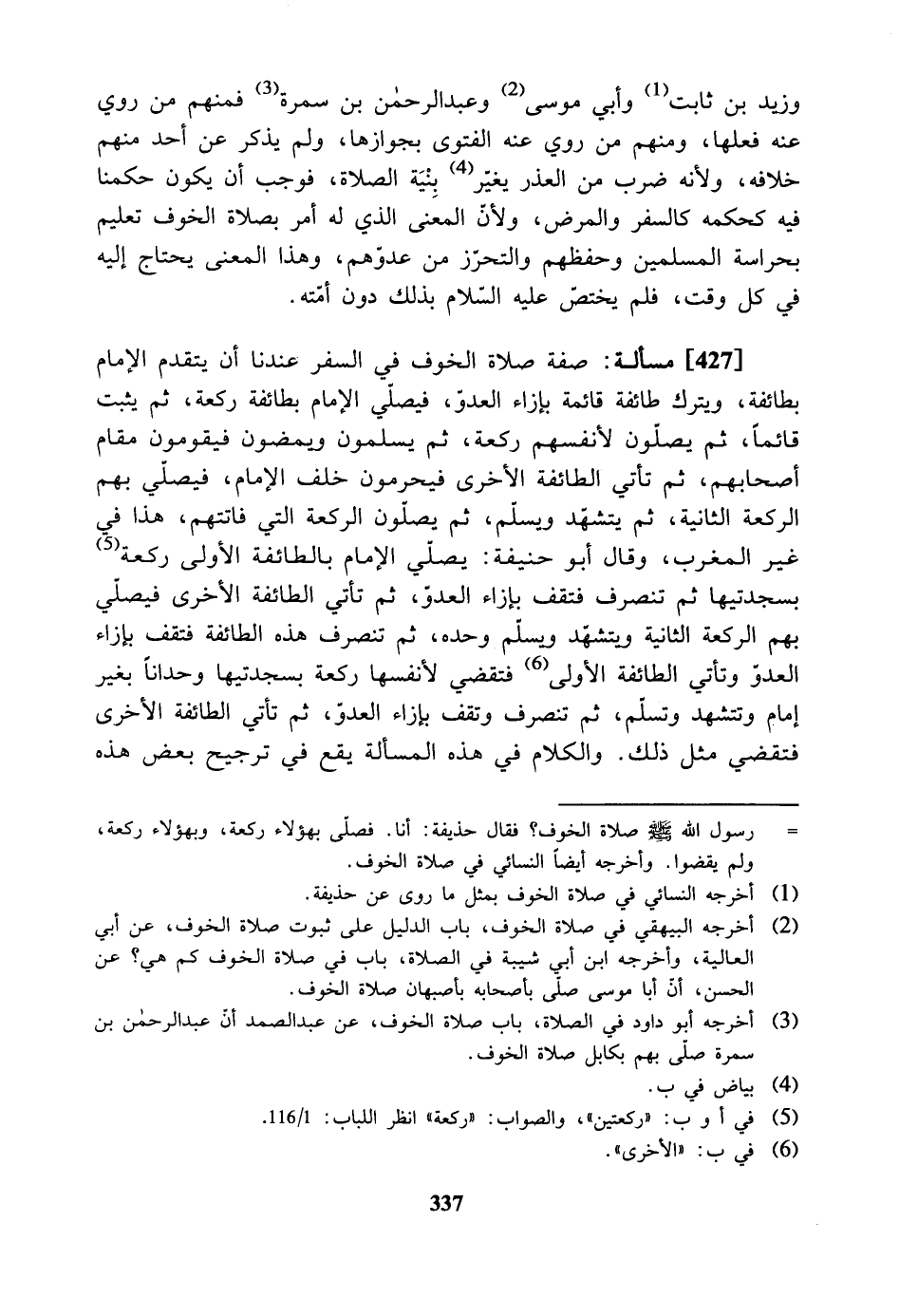 [427] مسألة: صفة صلاة الخوف في السفر عندنا أن يتقدم الإمام بطائفة، ويترك طائفة قائمة بإزاء العدو، فيصلي الإمام بطائفة ركعة، ثم يثبت قائماً، تم يصلون لأنفسهم ركعة، ثم يسلمون ويمضون، فيقومون مقام أصحابهم، ثم تأتي الطائفة الأخرى فيحرمون خلف الإمام، فيصلي بهم الركعة الثانية، ثم يتشهد ويسلم، ثم يصلون الركعة التي فاتتهم، هذا في غير المغرب، وقال أبو حنيفة: يصلي الإمام بالطائفة الأولى ركعة بسجدتيها، ثم تنصرف فتقف بإزاء العدو، ثم تأتي الطائفة الأخرى فيصلي بهم الركعة الثانية ويتشهد ويسلم وحده، ثم تنصرف هذه الطائفة فتقف بإزاء العدو وتأتي الطائفة الأولى فتقضي لأنفسها ركعة بسجدتيها وحدانا بغير إمام وتتشهد وتسلم، ثم تنصرف وتقف بإزاء العدو، ثم تأتي الطائفة الأخرى فتقضي مثل ذلك. والكلام في هذه المسألة يقع في ترجيح بعض هذه