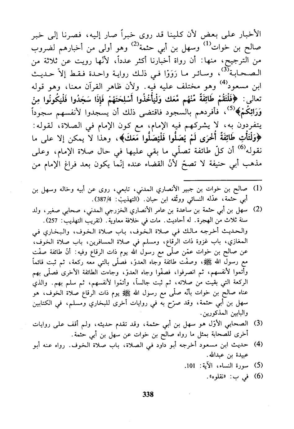 الأخبار على بعض لأن كلينا قد روى خبراً صار إليه، فصرنا إلى خبر صالح بن خوات، وسهل بن أبي حثمة، وهو أولى من أخبارهم لضروب من الترجيح، منها: أن رواة أخبارنا أكثر عدداً؛ لأنها رويت عن ثلاثة من الصحابة وسائر ما رووا في ذلك رواية واحدة فقط إلا حديث ابن مسعود وهو مختلف عليه فيه. ولأن ظاهر القرآن معنا، وهو قوله تعالى: {فلتقم طائفة منهم معك وليأخذوا أسلحتهم فإذا سجدوا فليكونوا من ورائكم}، فأفردهم بالسجود فاقتضى ذلك أن يسجدوا لأنفسهم سجوداً ينفردون به، لا يشركهم فيه الإمام في الصلاة، لقوله تعالى: {ولتأت طائفة أخرى لم يصلوا فليصلوا معك}، وهذا لا يمكن إلا على ما نقوله: أن كل طائفة تصلي ما بقي عليها في حال صلاة الإمام، وعلى مذهب أبي حنيفة لا تصح؛ لأن القضاء عنده إنما يكون بعد فراغ الإمام من